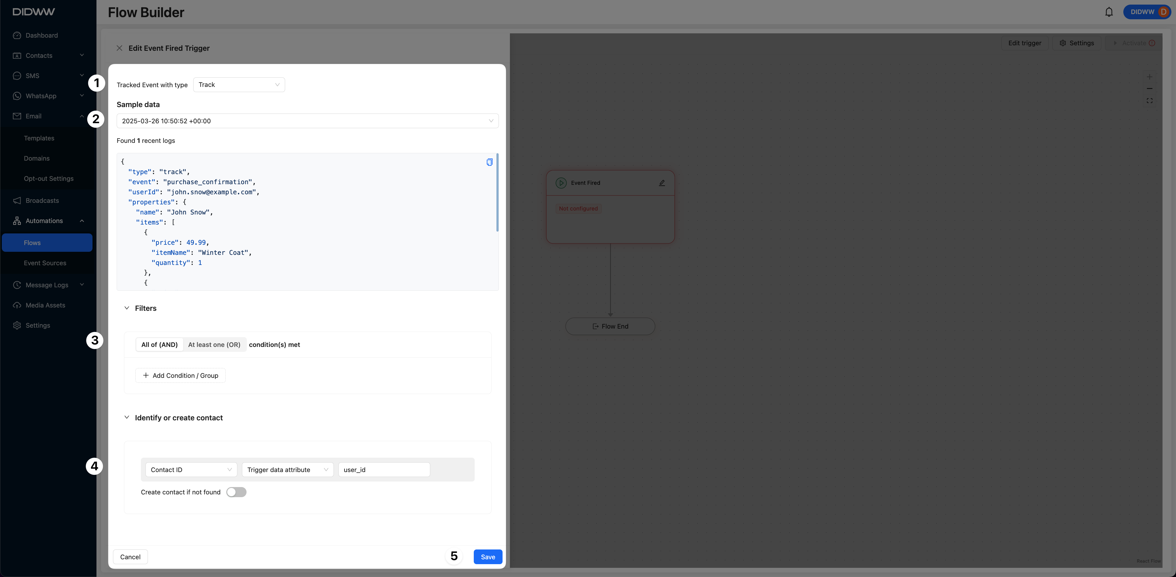 Event Fired triggered automation flows run when a specific event is received. These flows enable real-time, behavior-based communication such as onboarding, transaction confirmations, or custom interactions. By integrating tracked events into your automation logic, you can create highly personalized and timely user experiences.