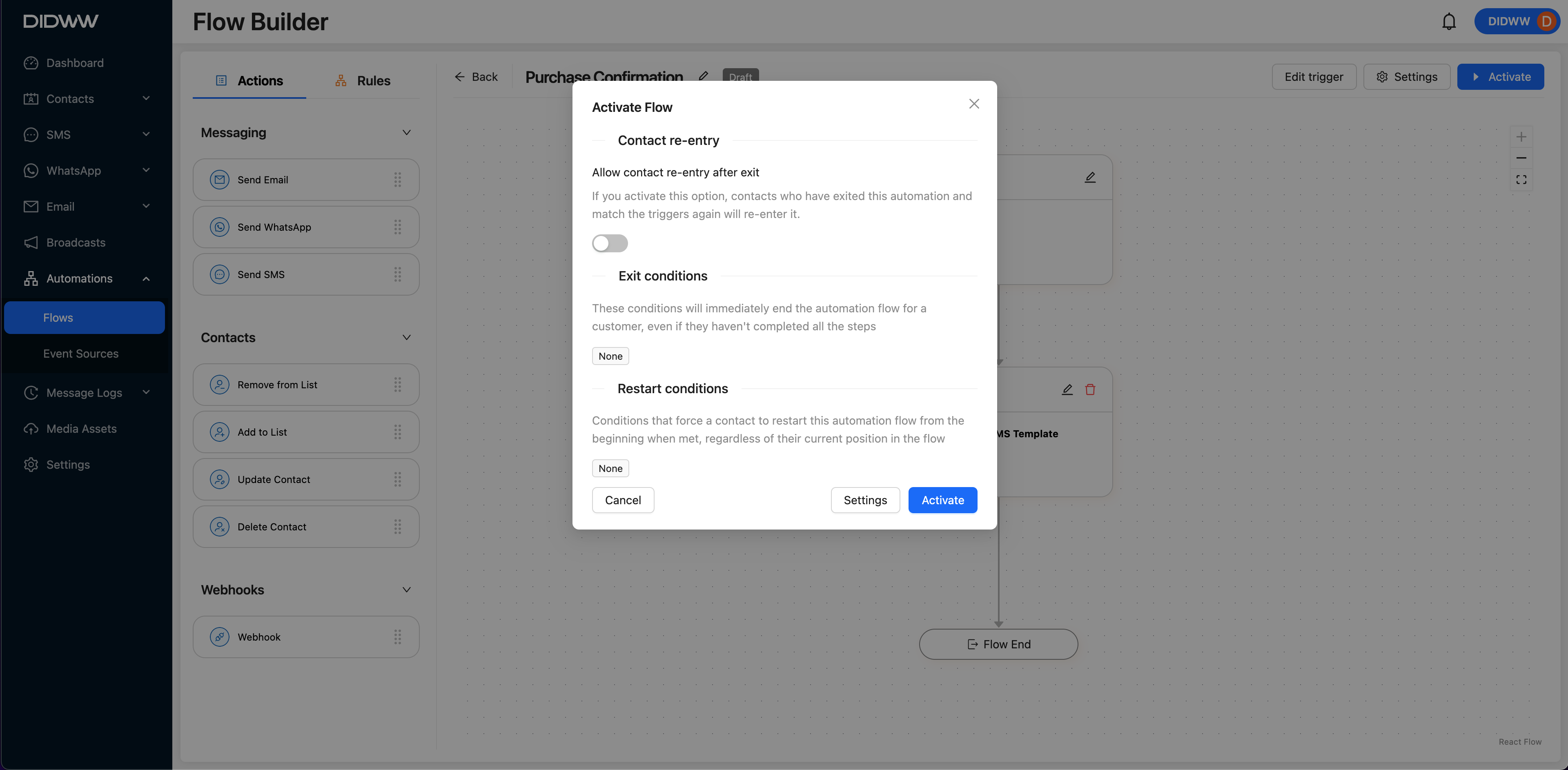 A modal window appears with optional settings you can configure before activating the flow. These settings control how contacts enter, exit, or restart the automation. Adjust them as needed before proceeding. To learn more about optional settings, see Activate the Automation Flow in Step 6.