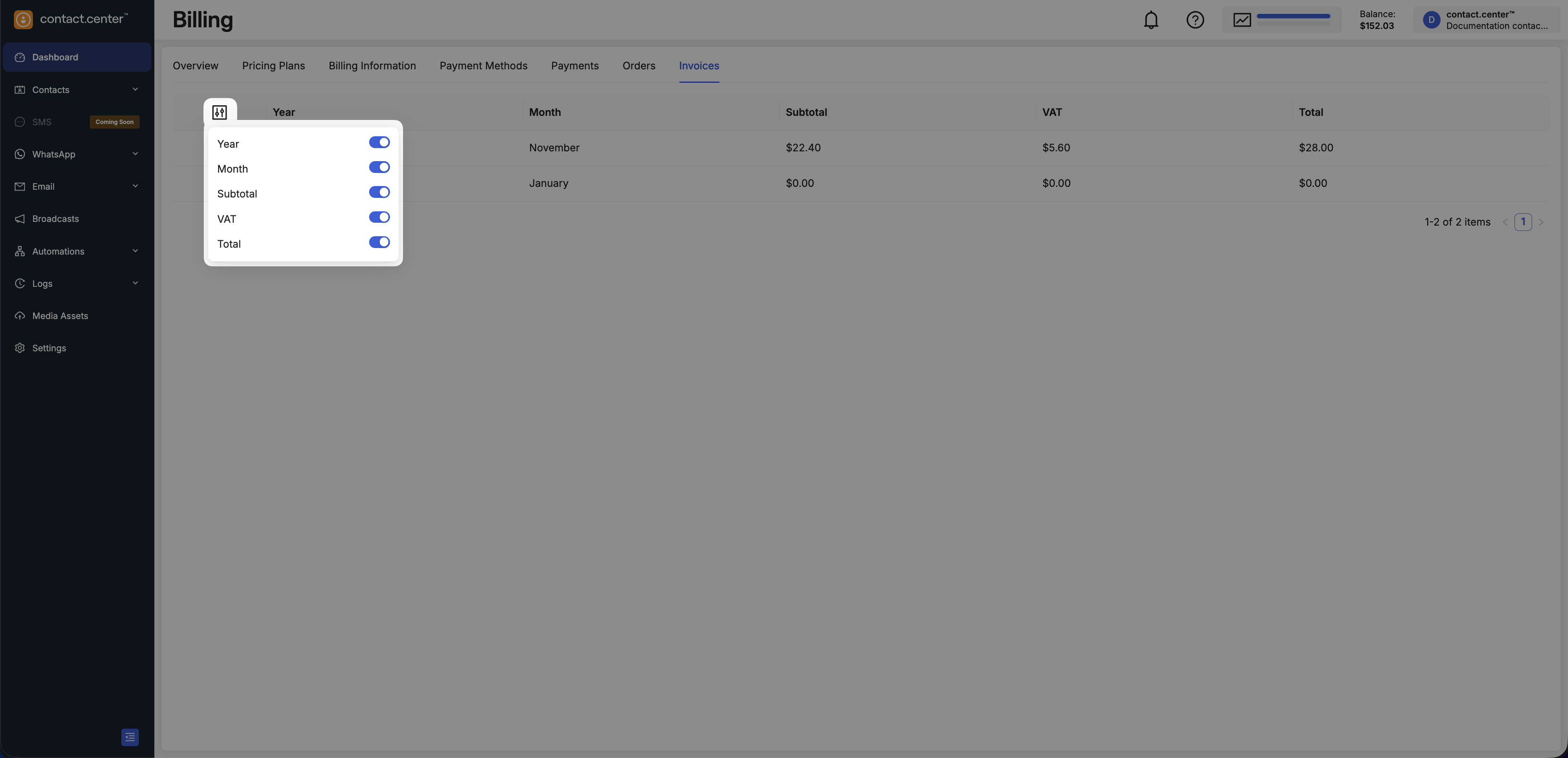 You can customize which columns are displayed in the Invoices table.