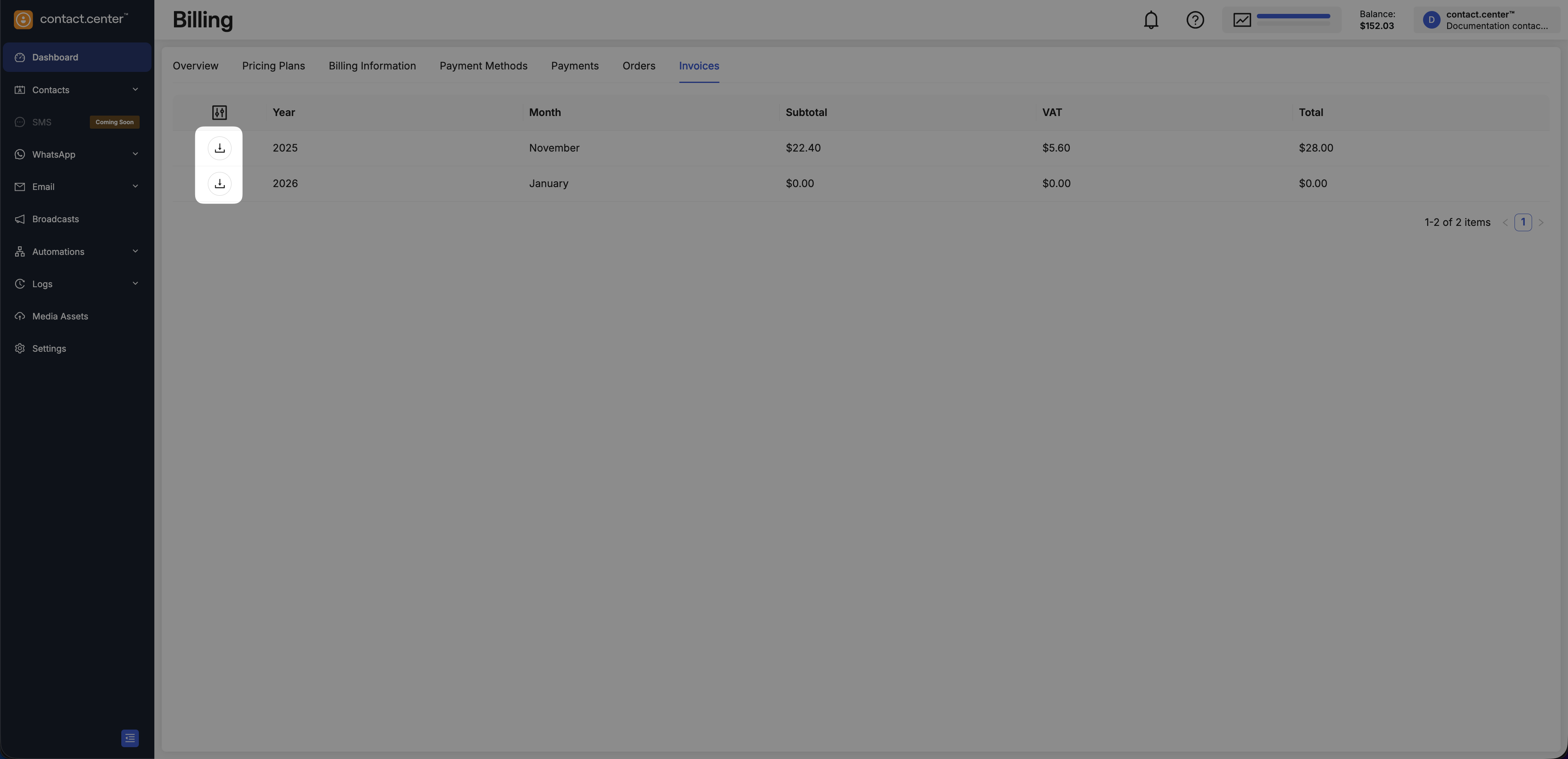 Use the Invoices page to review invoices for your workspace and download invoice documents for your records.