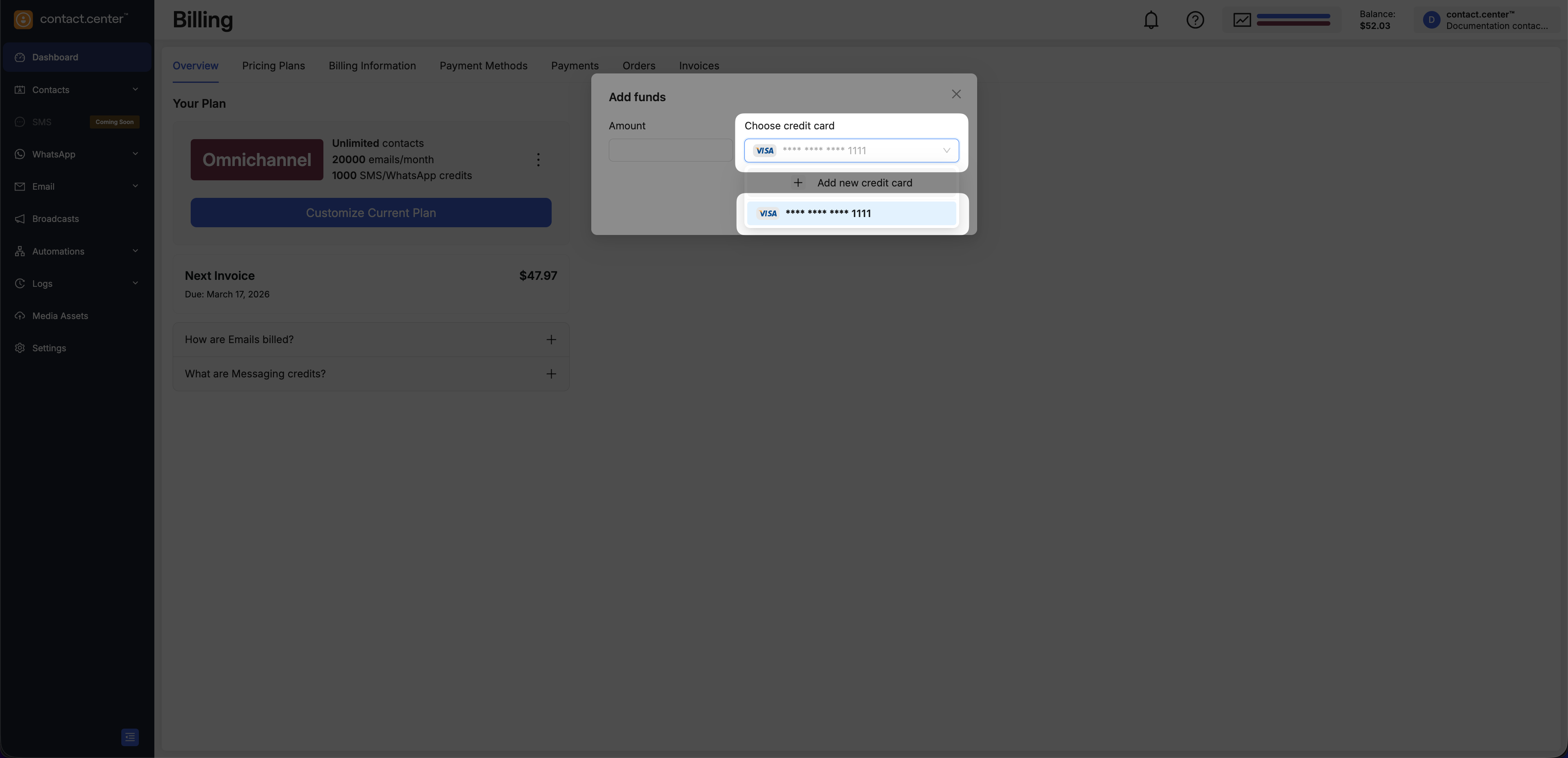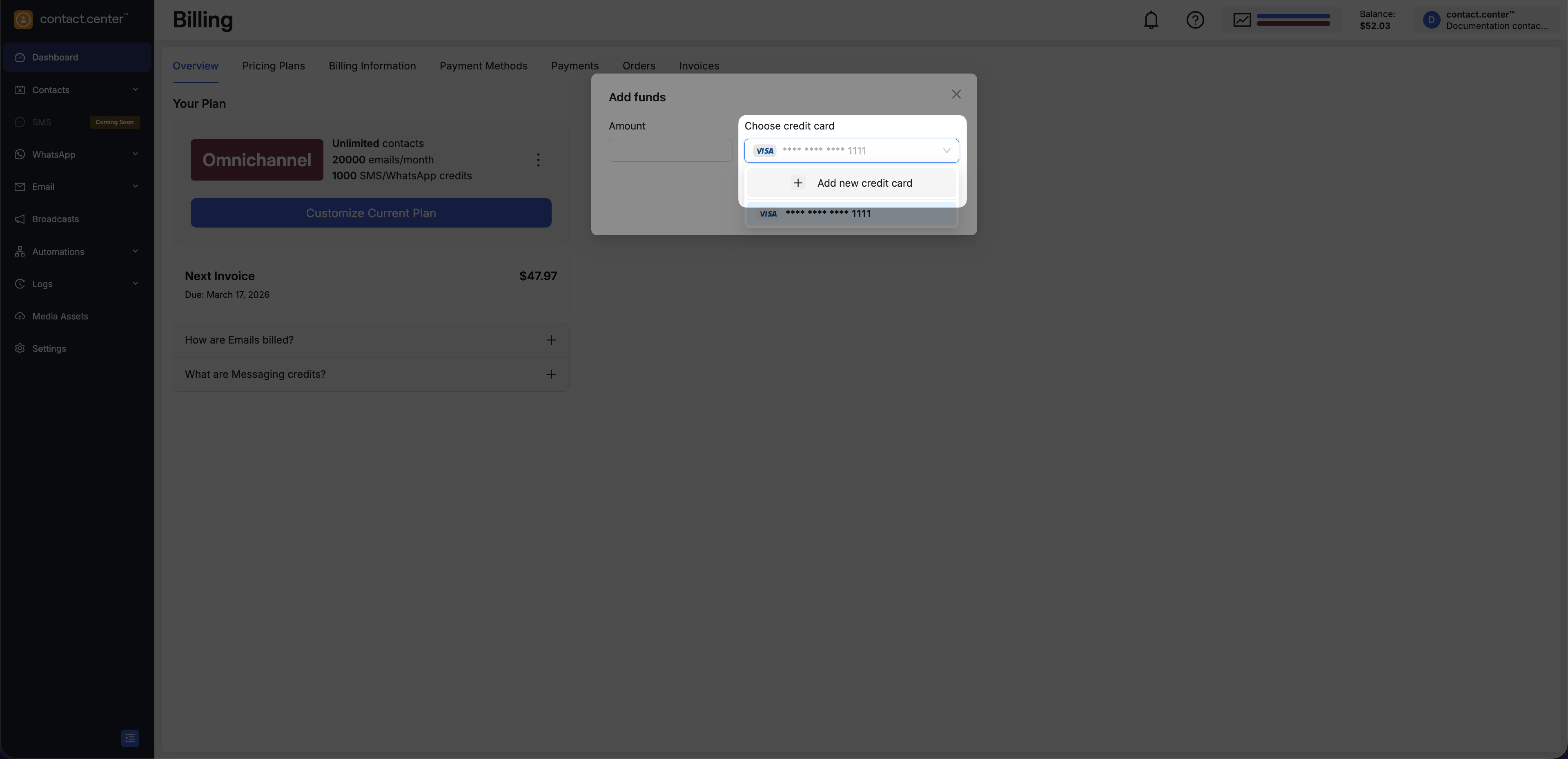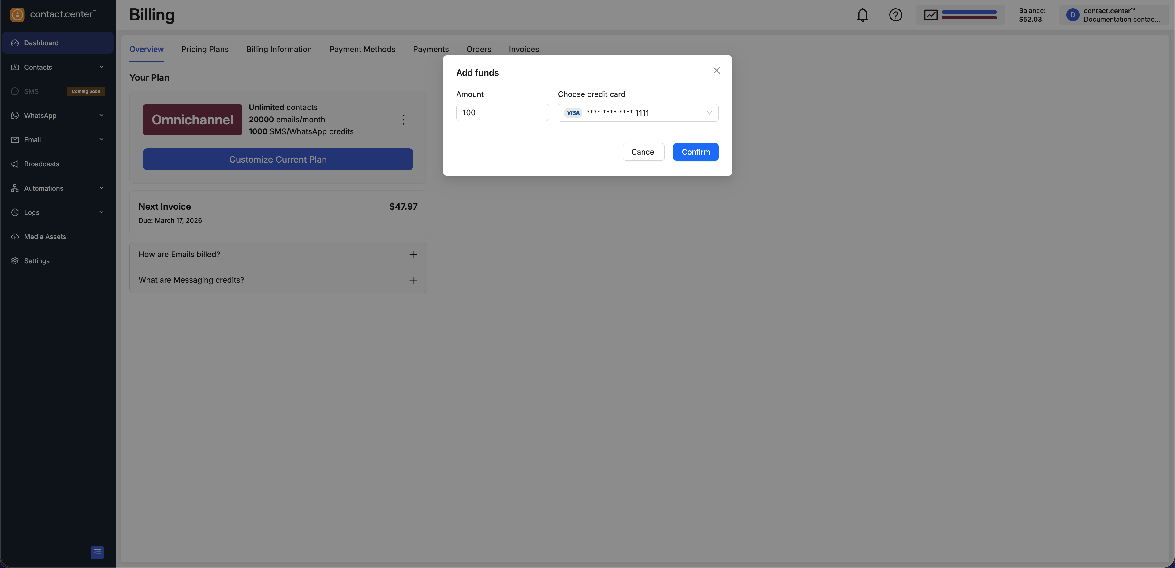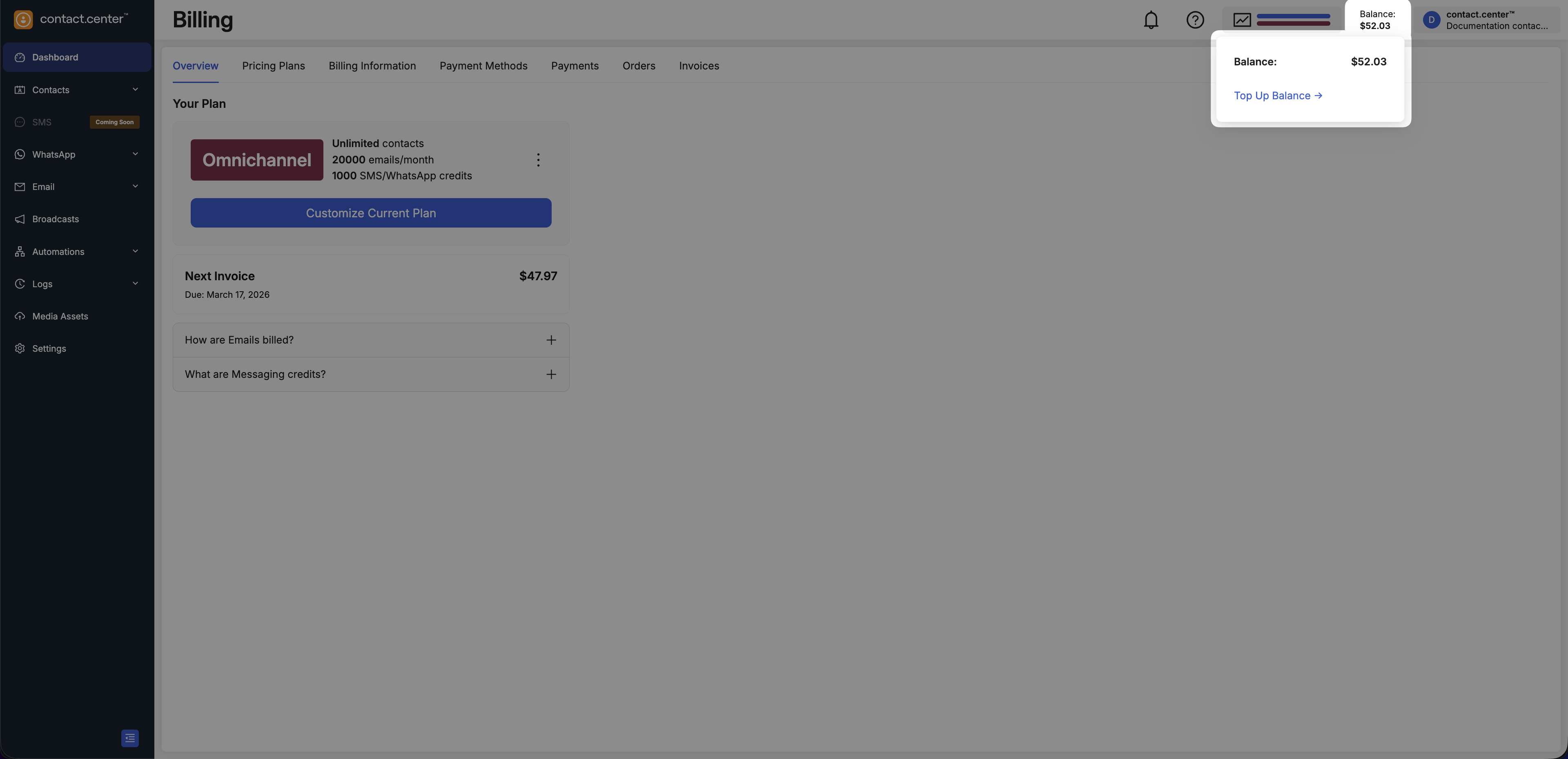 Use your account balance to pay for subscription upgrades, plan changes, and other chargeable services in contact.center™.