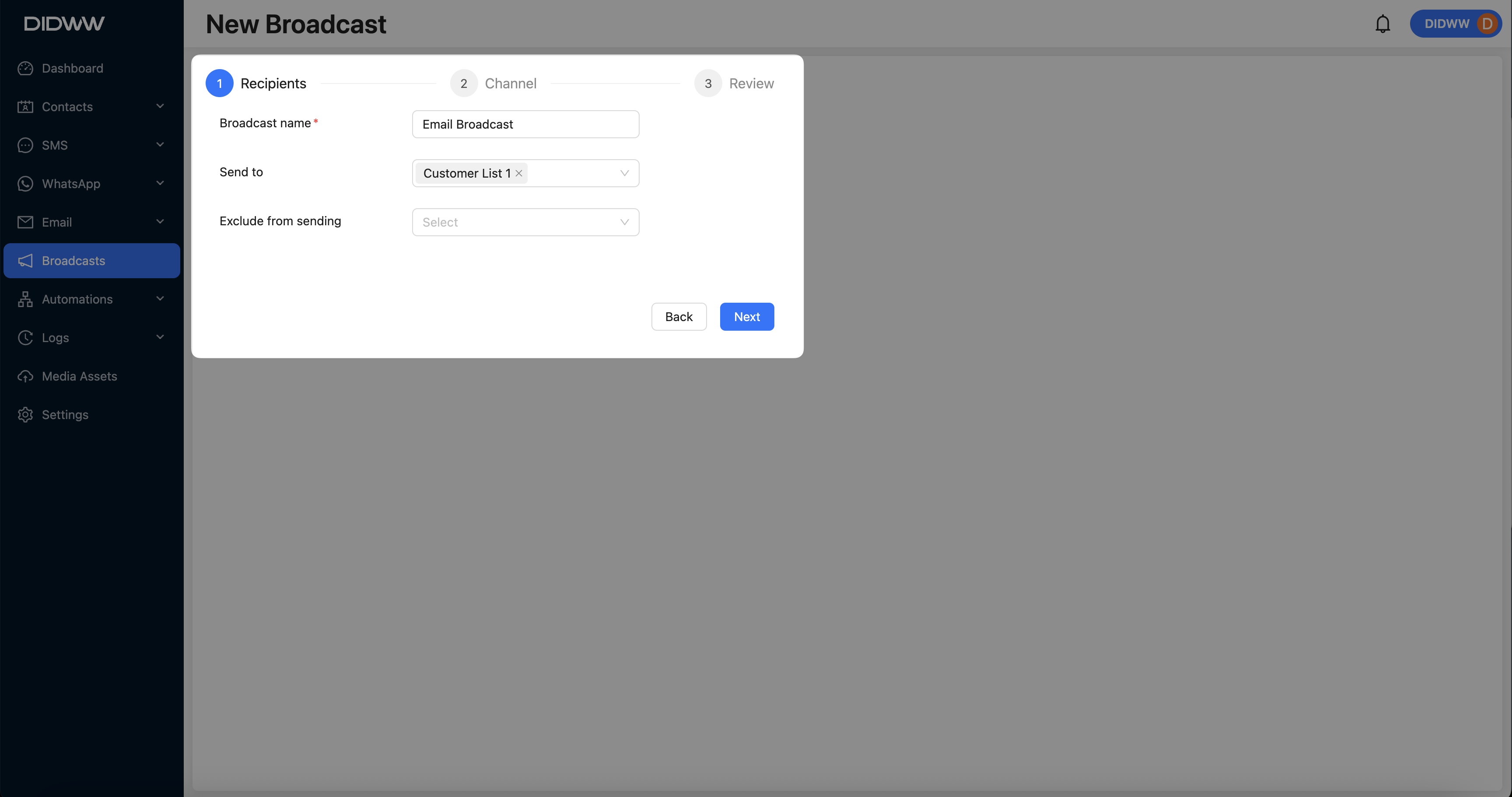 To create a new Email broadcast, follow these steps: