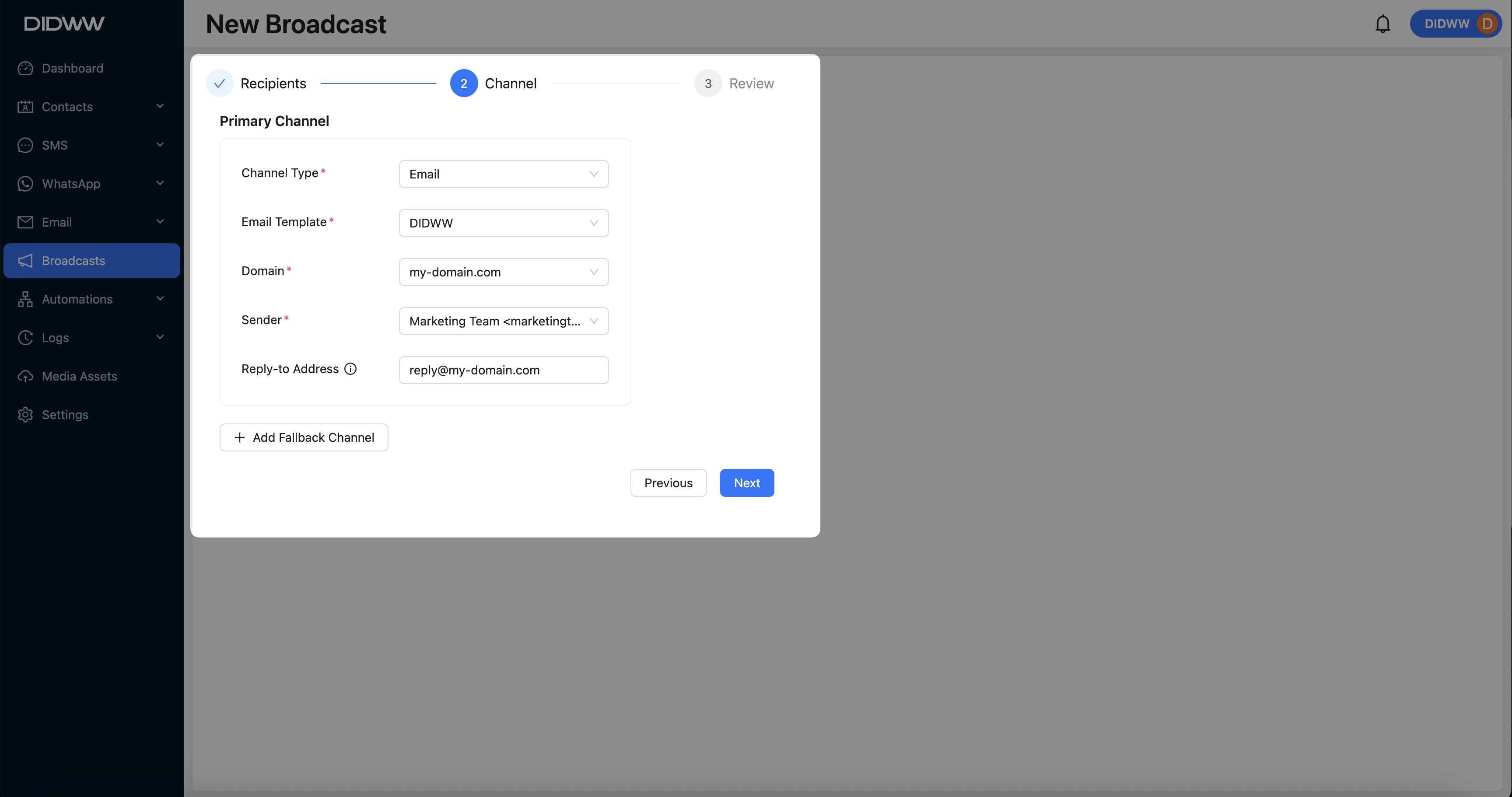 Optionally, you can configure a fallback channel using SMS or WhatsApp. A fallback channel ensures delivery through an alternative method if the primary channel fails.