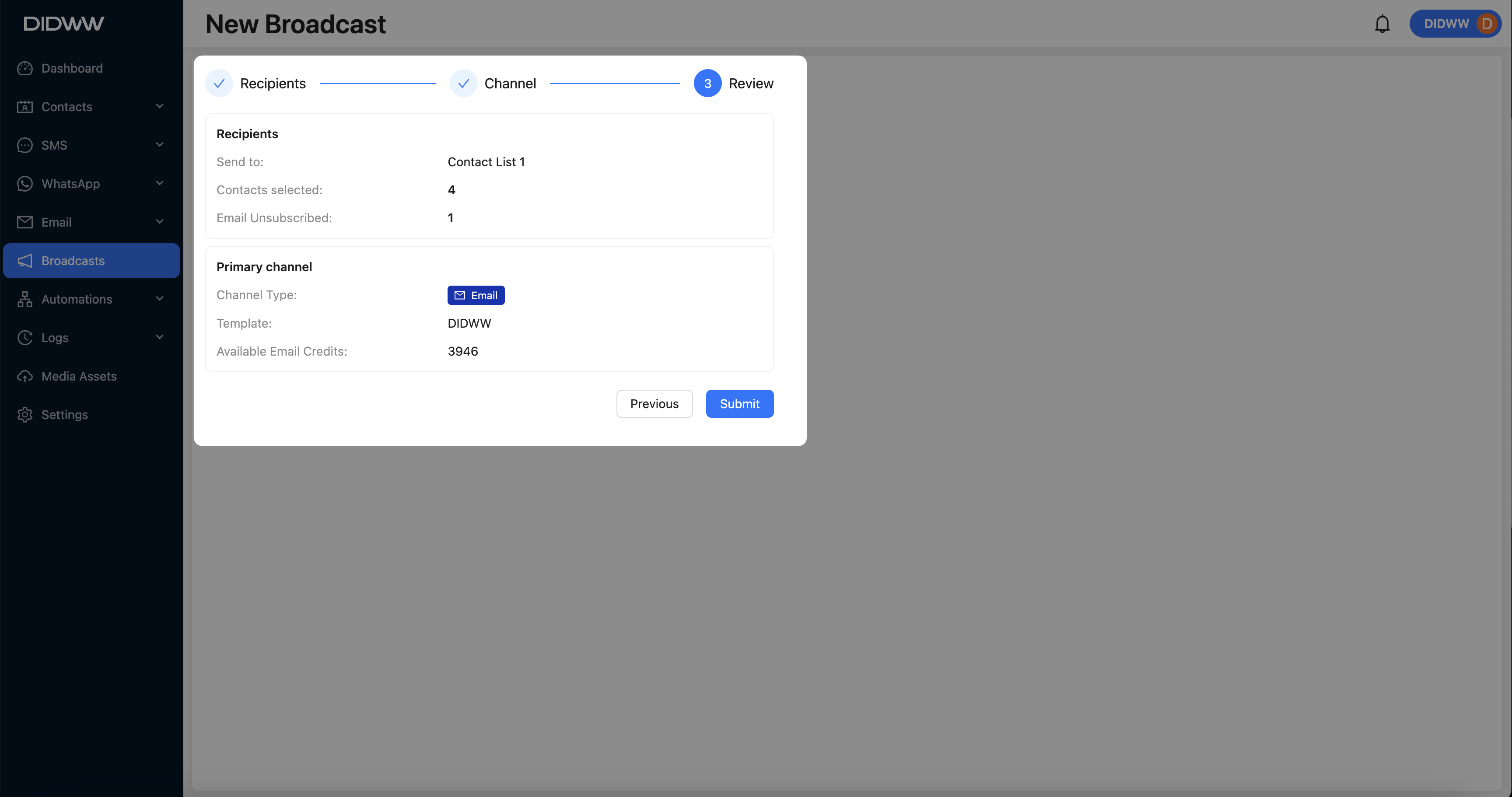 Review and Submit – Review recipient and channel settings before finalizing the broadcast.