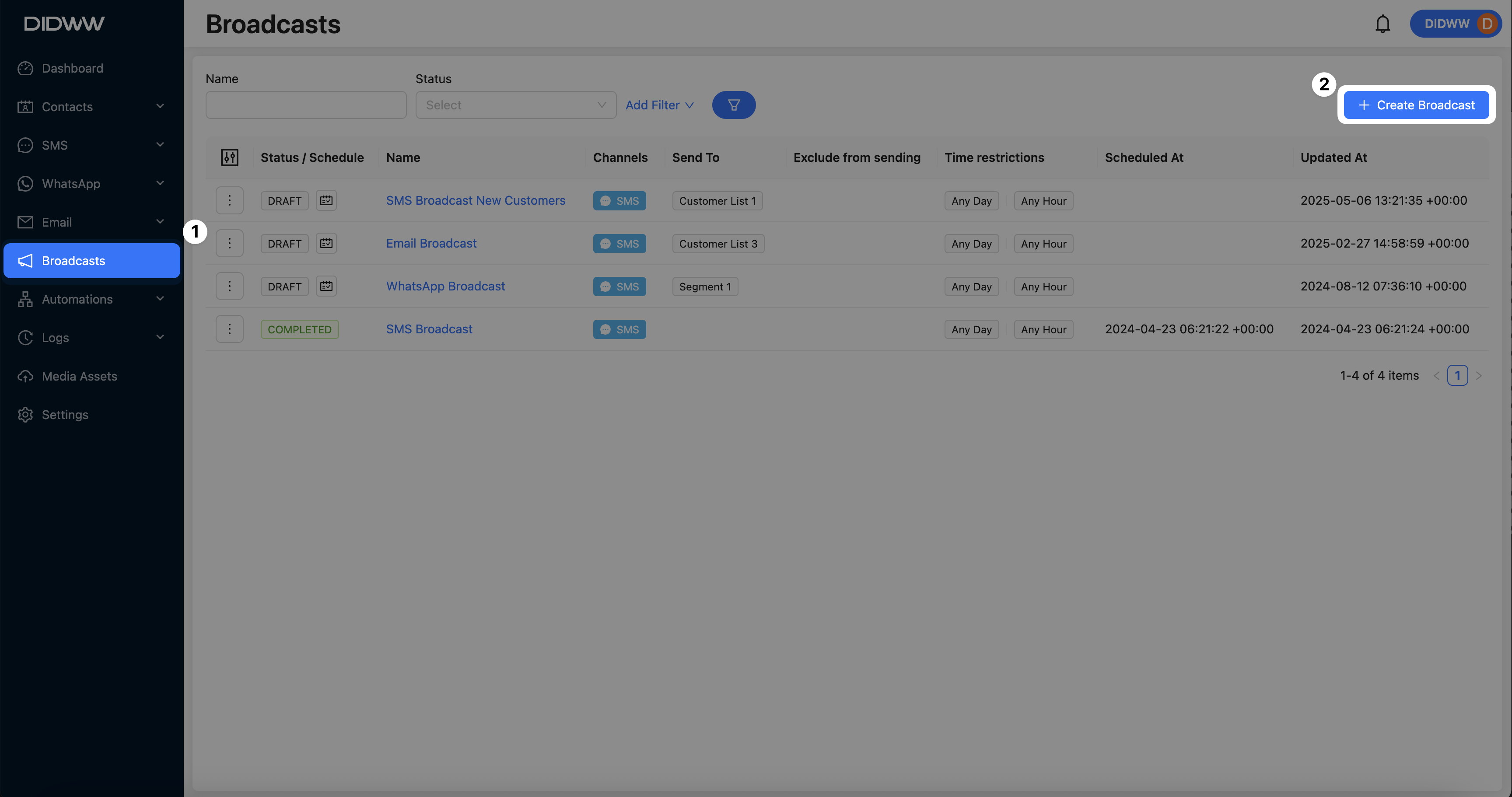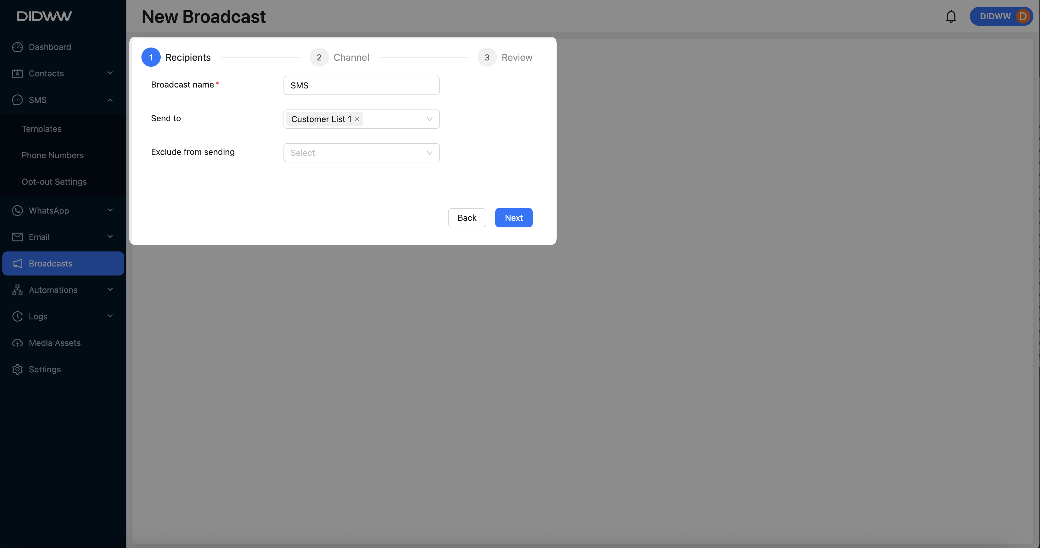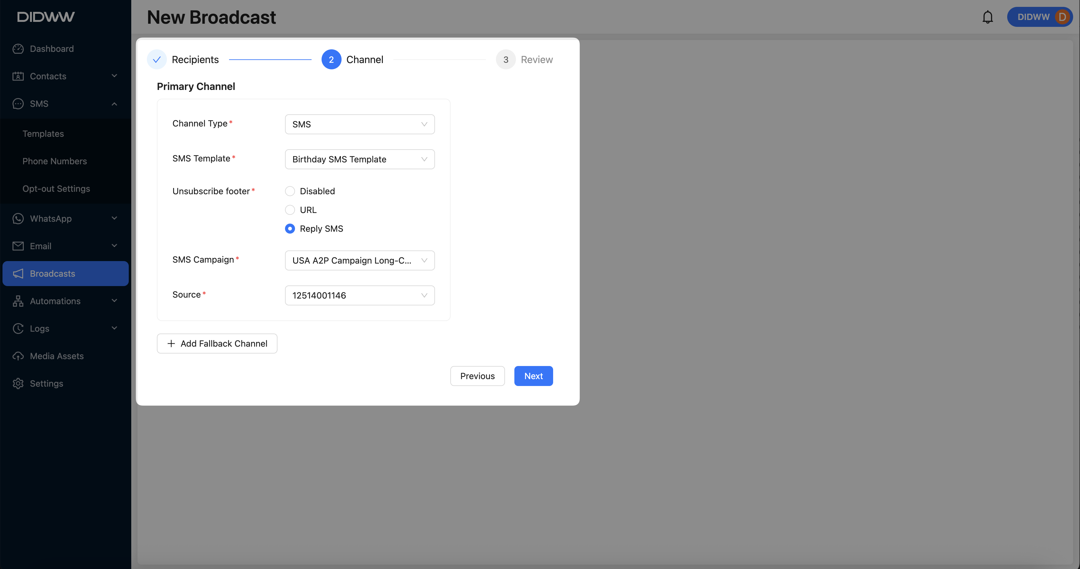 Select Recipients – Choose specific contact lists or segments for the broadcast.