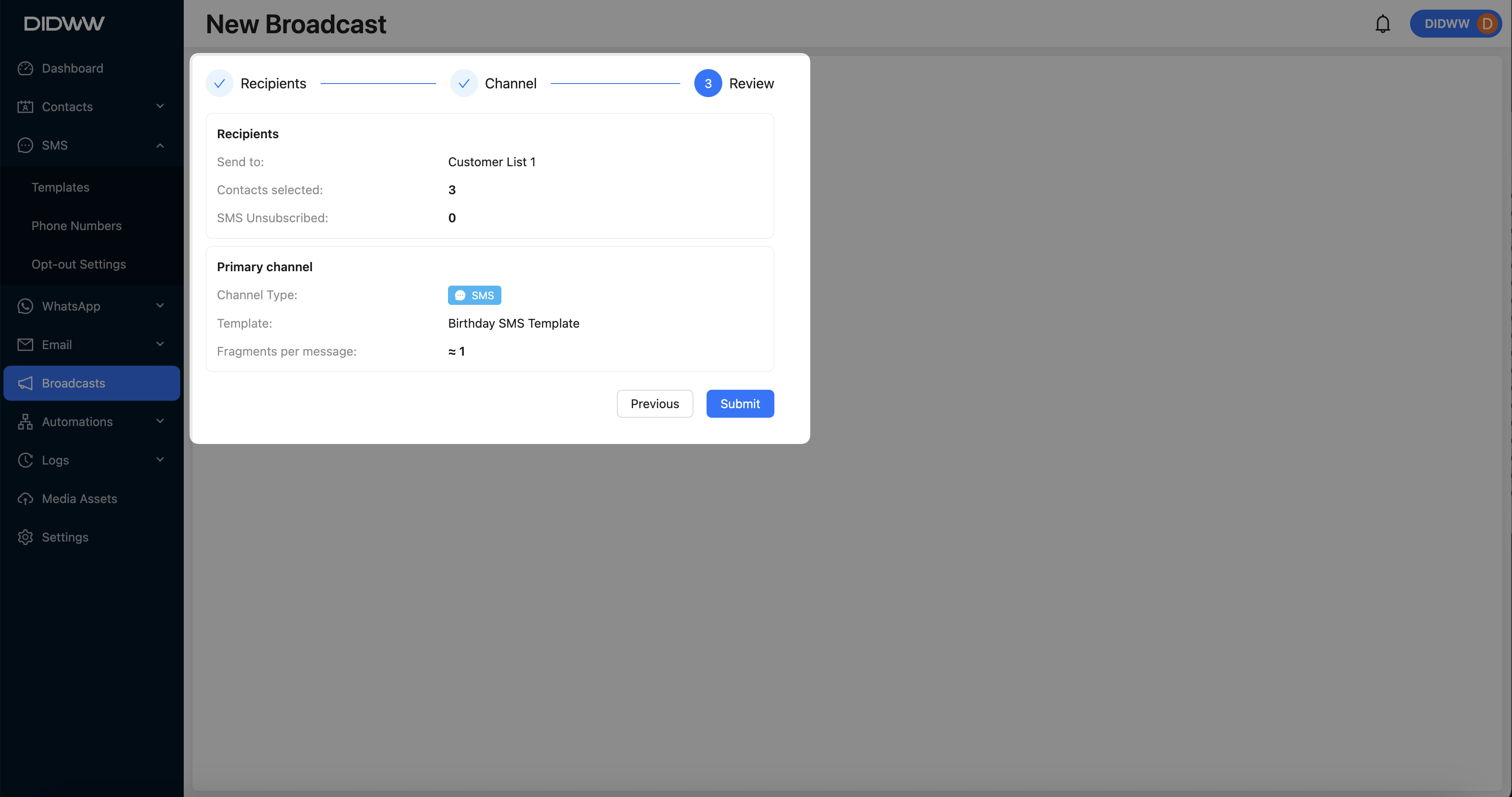 Review all the configured settings, then click Submit to create the SMS broadcast.