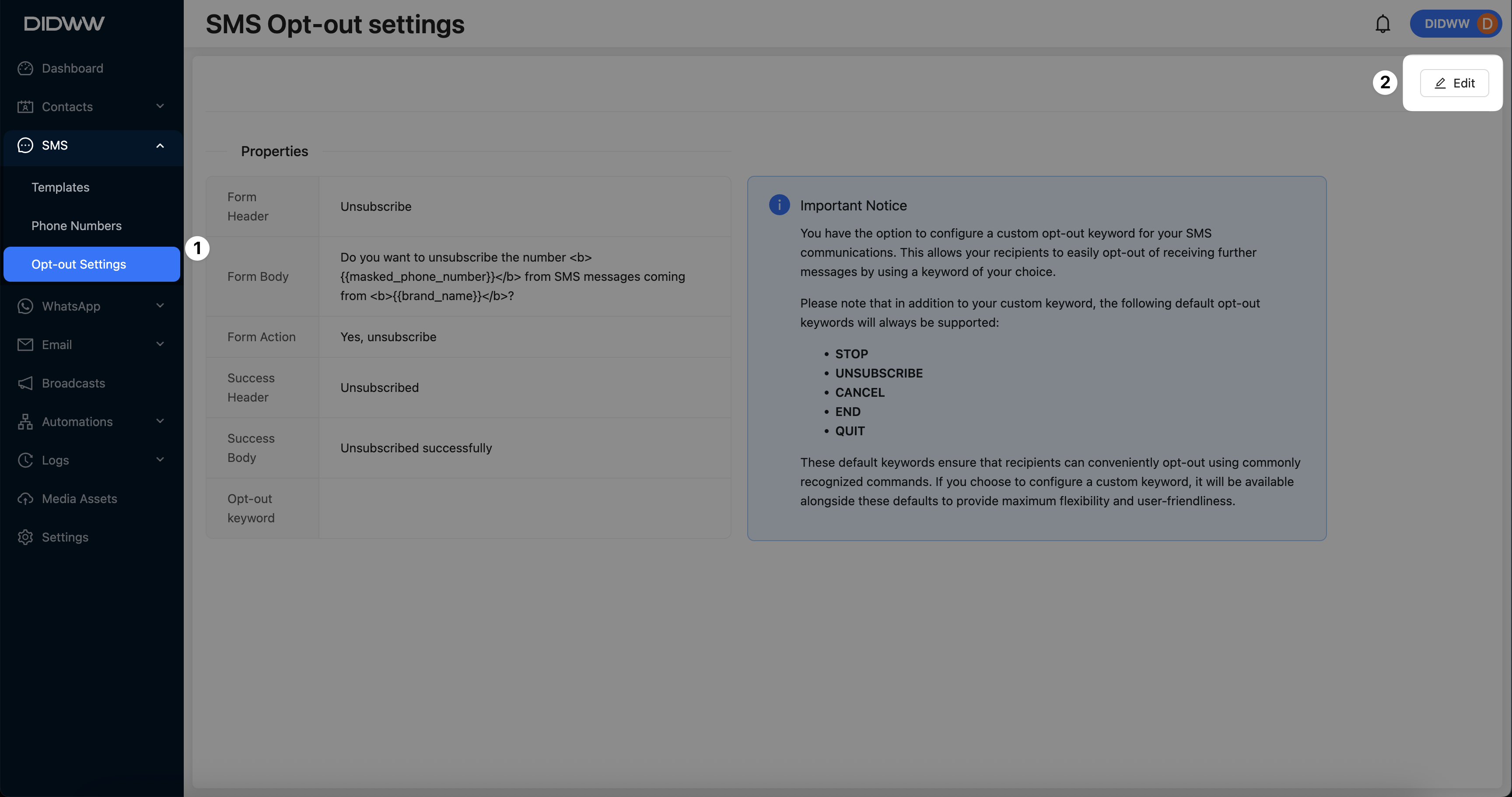 Fig. 4. Editing SMS Opt-out Reply Keyword.¶