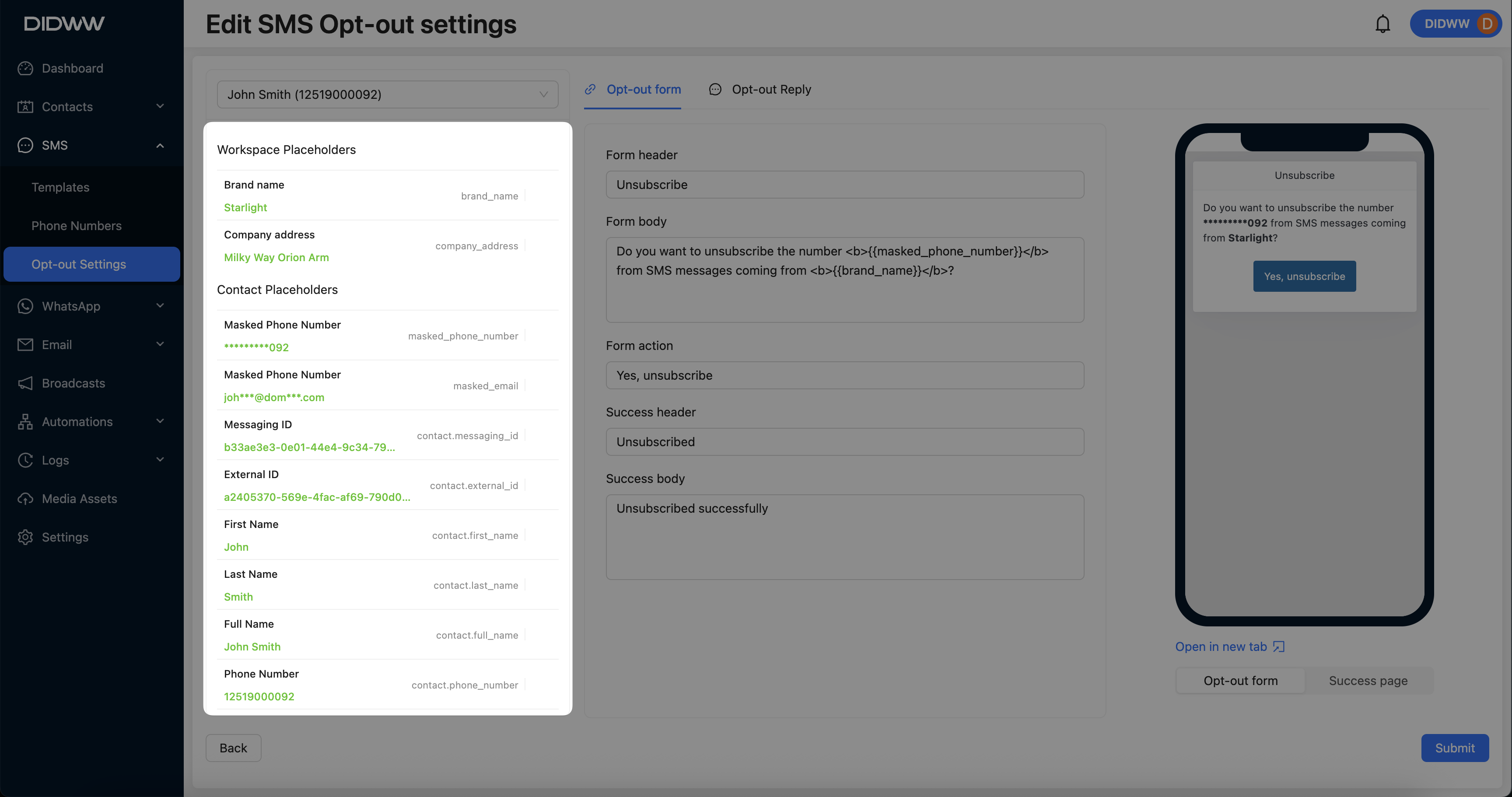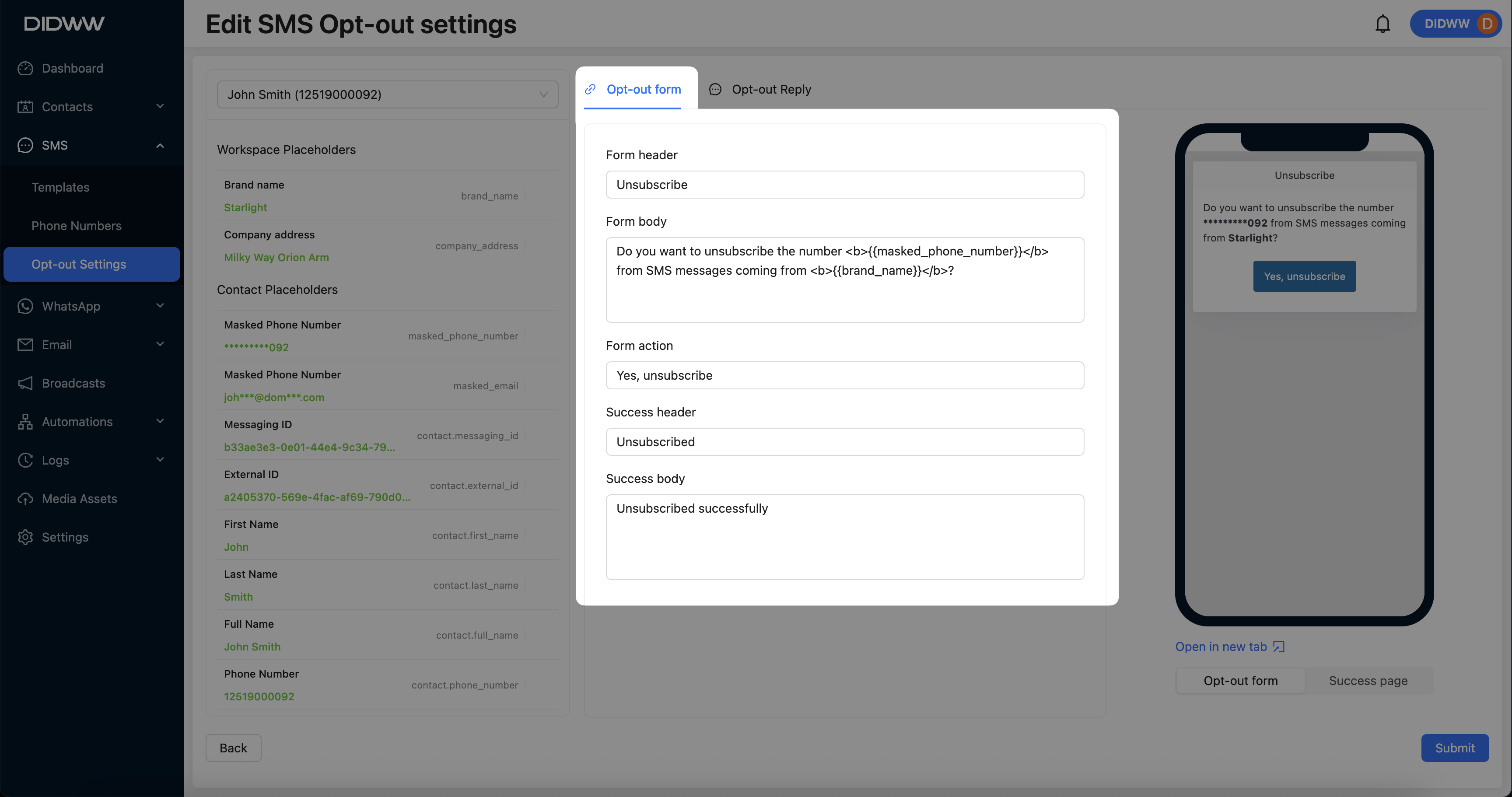 Using placeholders allows you to display personalized details, such as the recipient’s masked phone number or your workspace name, enhancing the opt-out form experience.