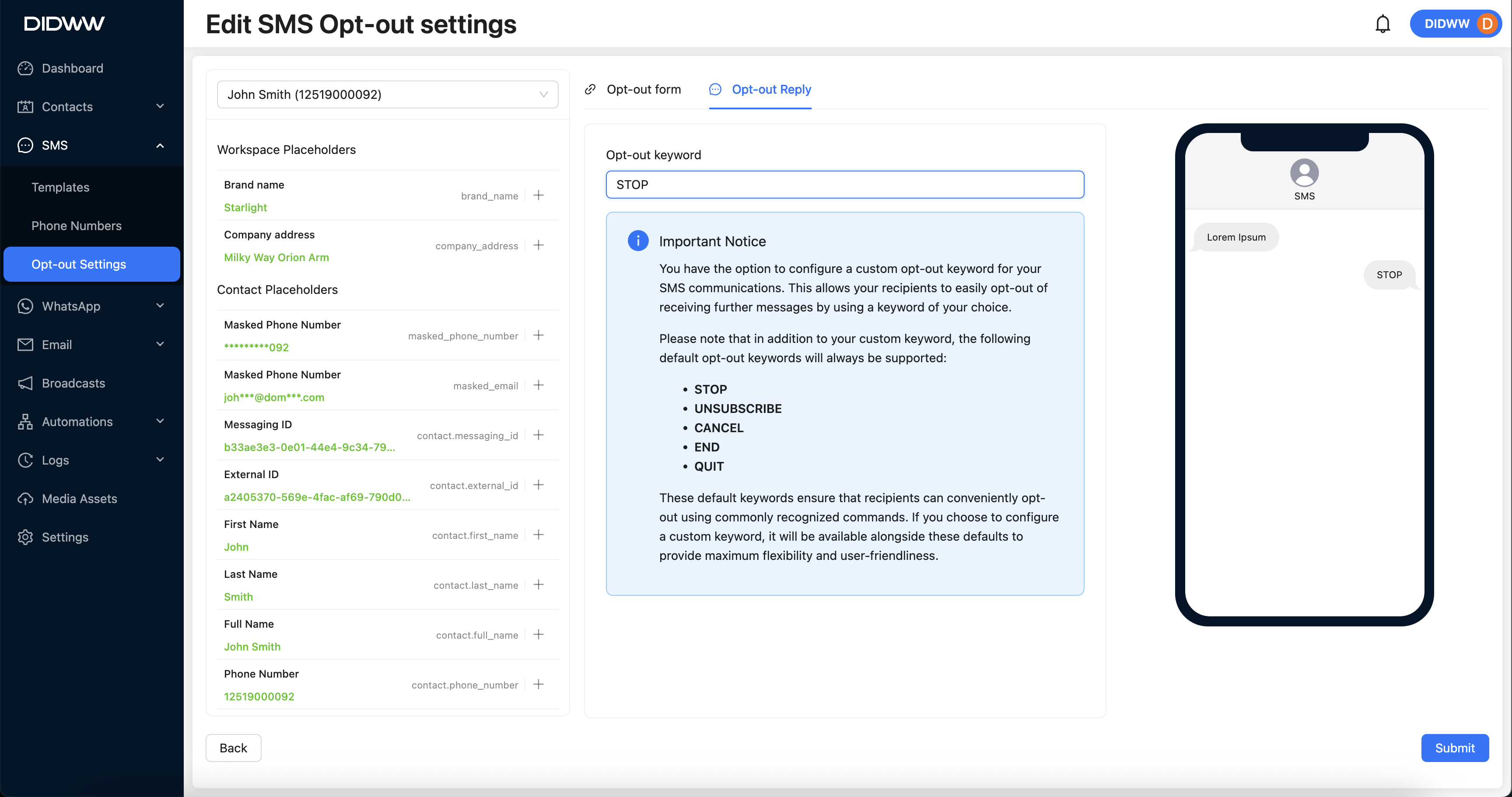 On the Opt-out Reply settings Tab, you can configure the Opt-out keyword and write a custom keyword that user can write in the sms message to stop receiving the messages automatically and unsubscribe from it :