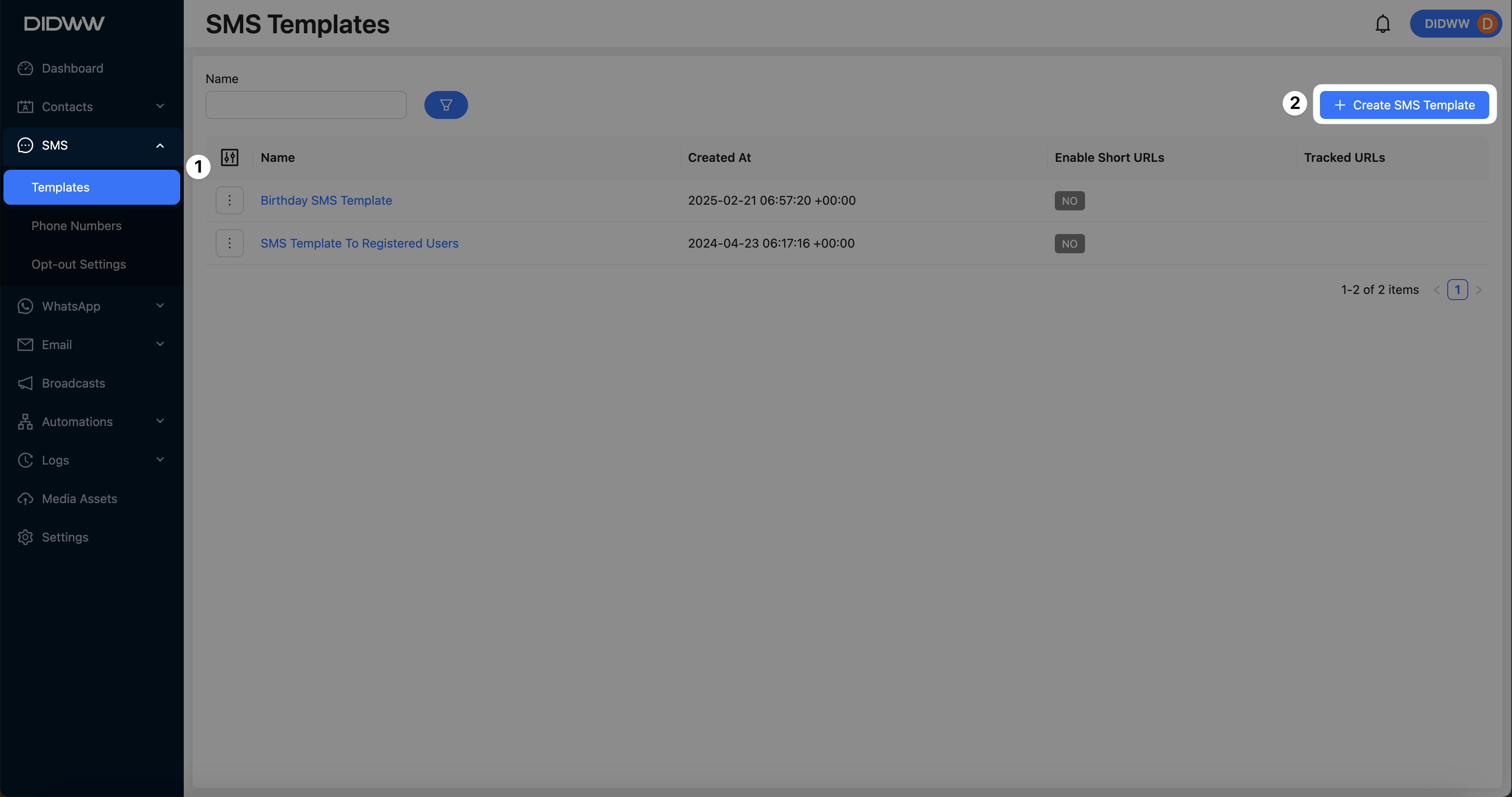 In the navigation menu, go to SMS > Templates, and then click + Create SMS Template.
