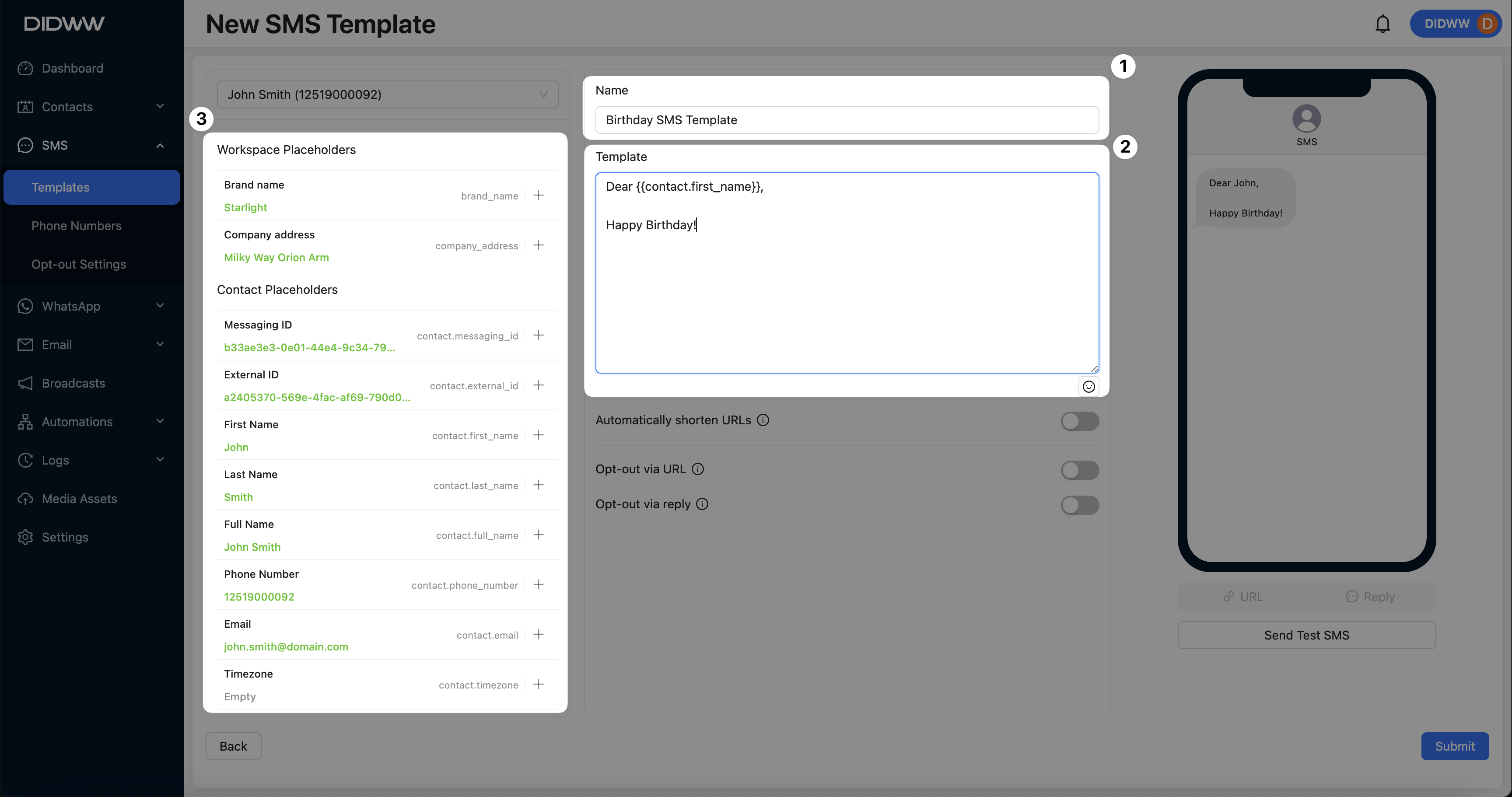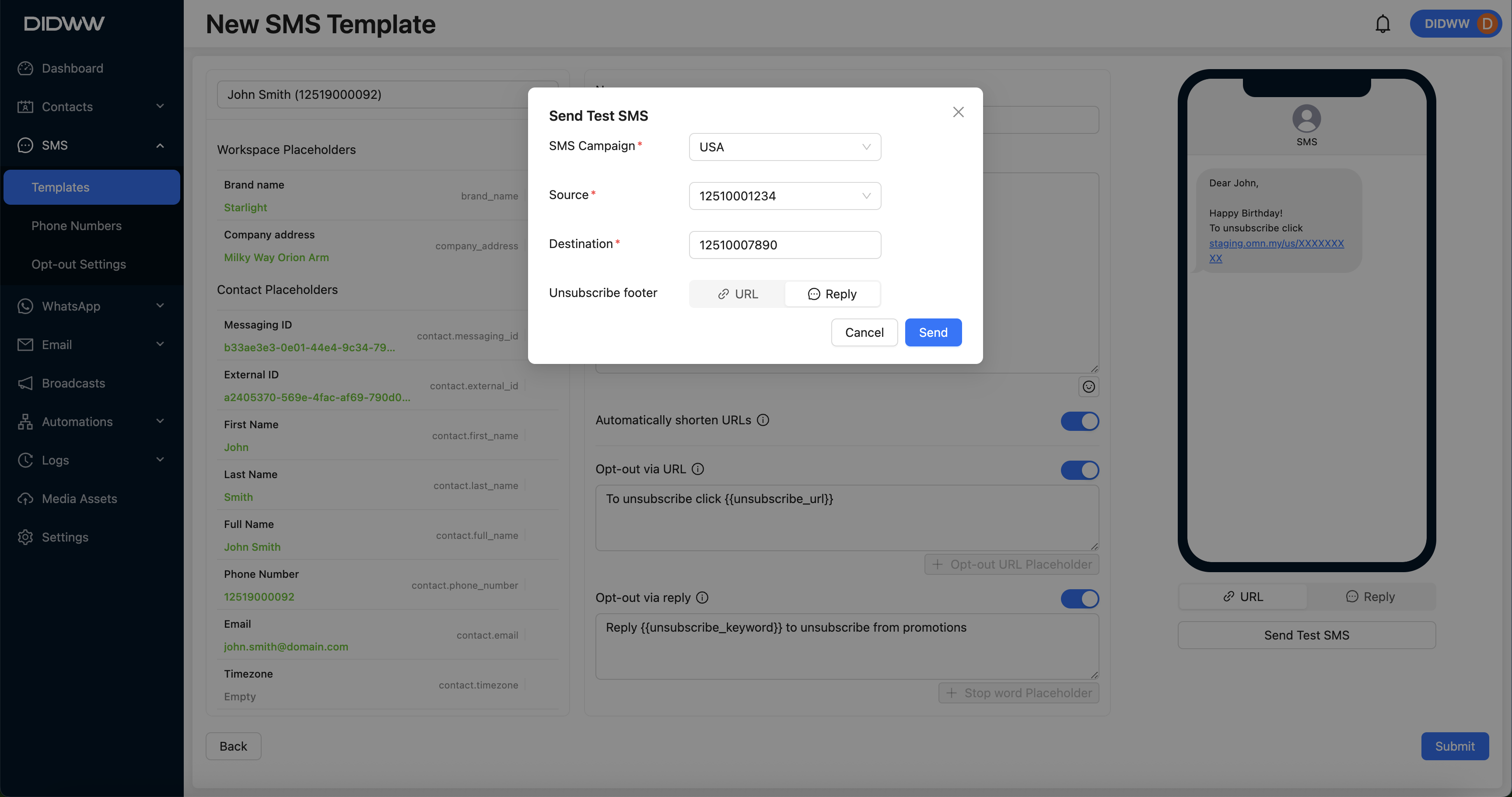 To test the message and ensure placeholder accuracy, click Send Test SMS.