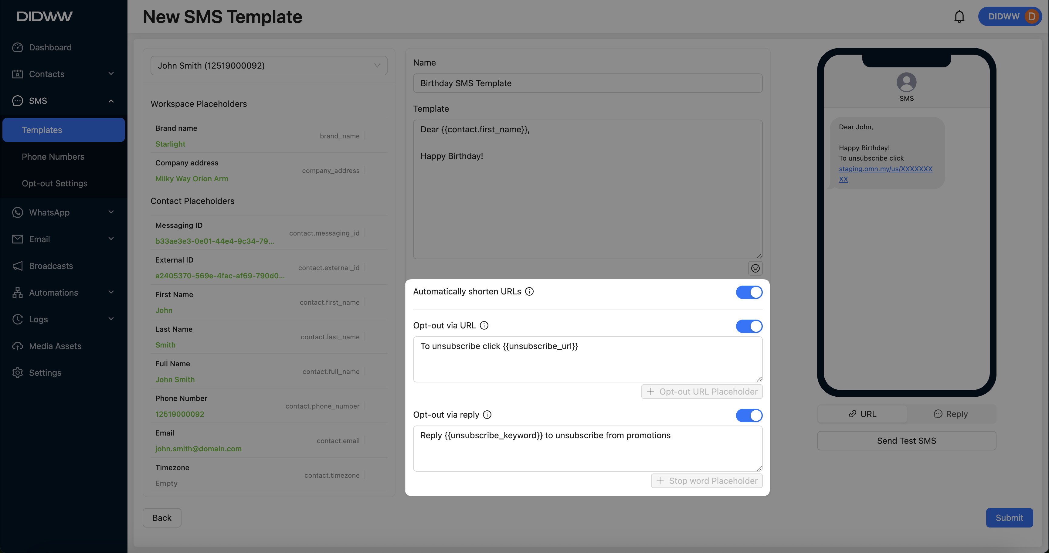 After configuring and testing, click Submit to save the SMS template.