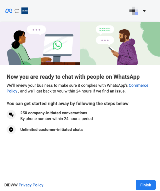 Step 9: When the WhatsApp business number integration is complete, click Finish to return to the contact.center™.