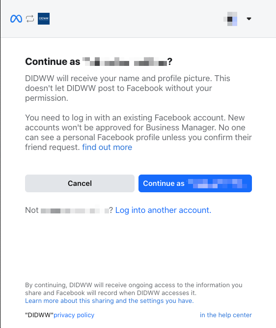 Step 2: Log into Facebook if you haven’t already or click Continue as [your name] if you are already signed in.
