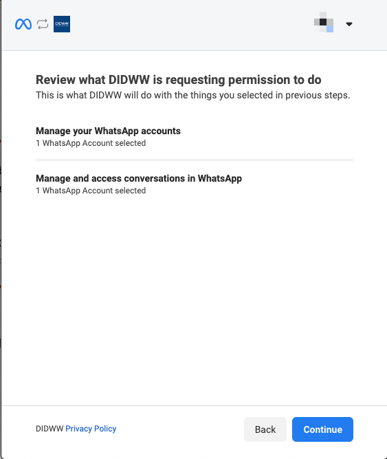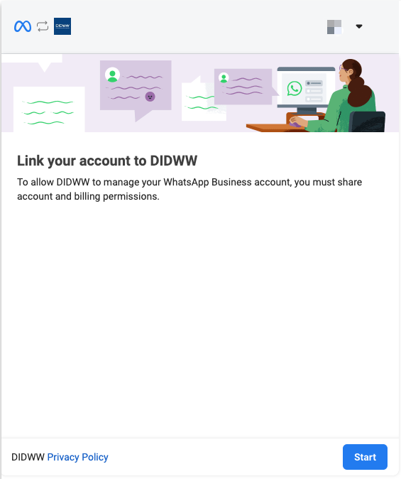 Step 3: Facebook will then ask you to allow contact.center™ to manage your WhatsApp Business Account. Click Start to proceed.