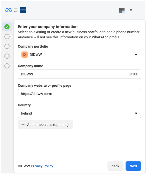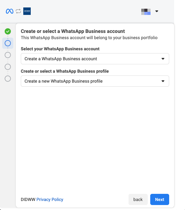 Select or Create a new WhatsApp Business Account and WhatsApp Business profile¶