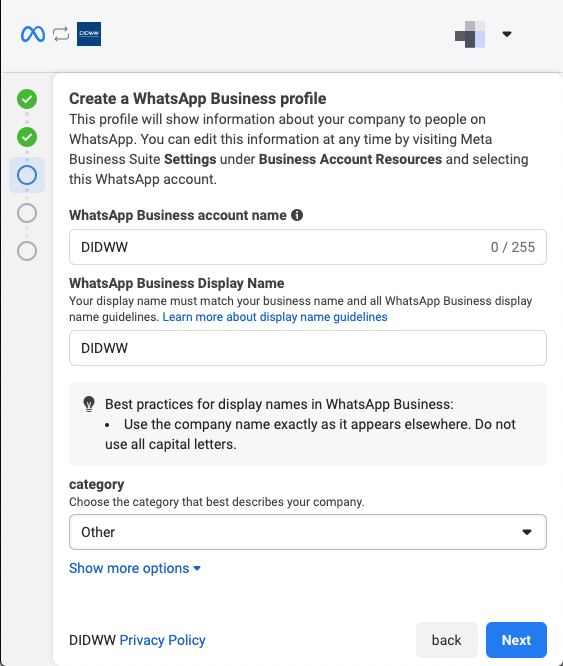 WhatsApp Business Display Name - This is what your customers will see. The name must meet the requirements set by WhatsApp .