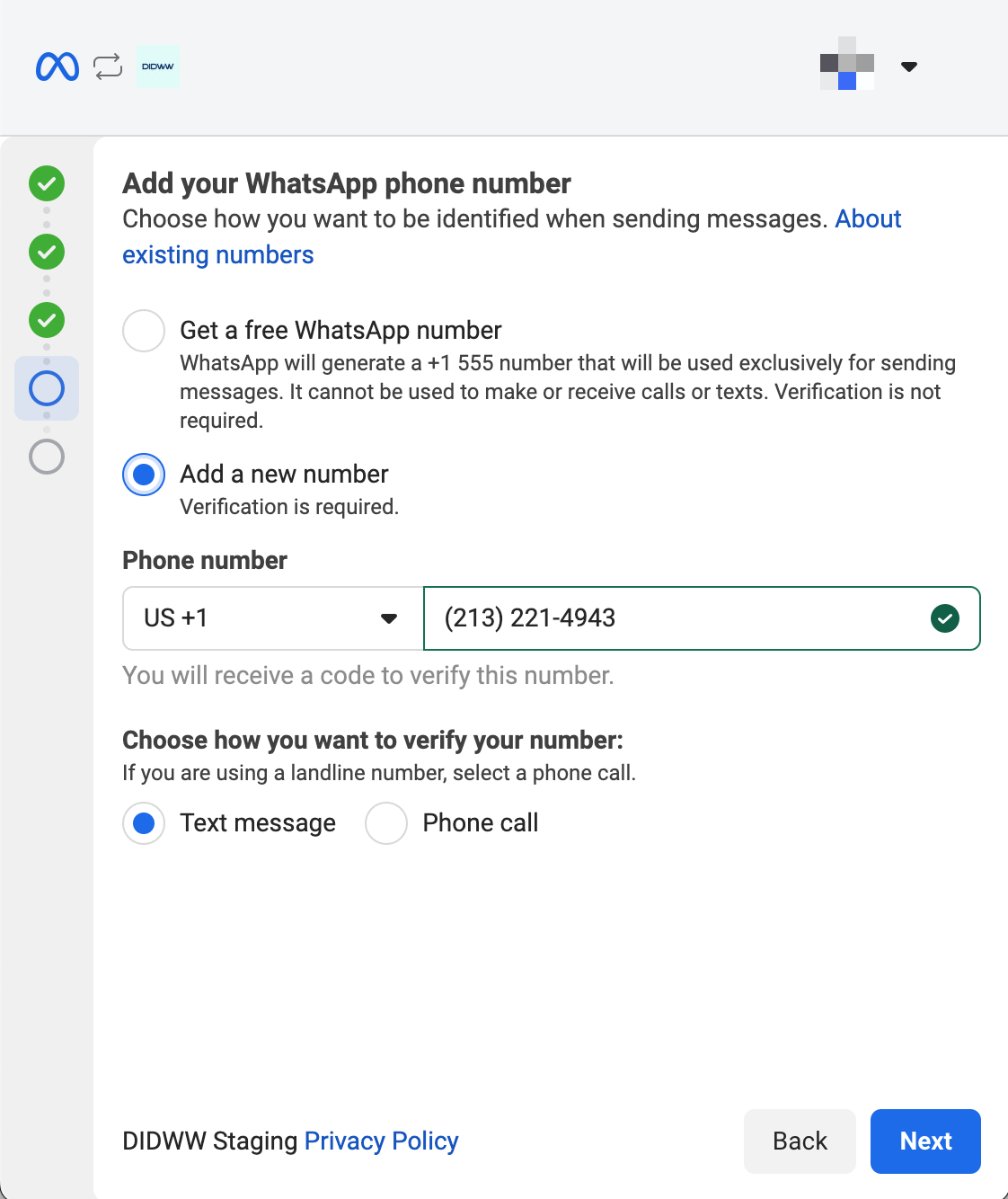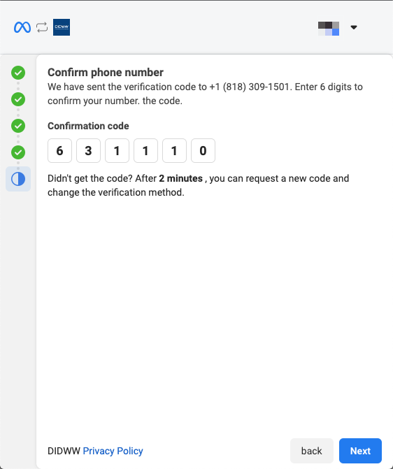 Step 7: Meta requires you to add a phone number and verify the ownership as a part of the registration process. This is done by sending a verification code using either SMS or an automated voice call. Follow the instructions below based on the type of your phone number: