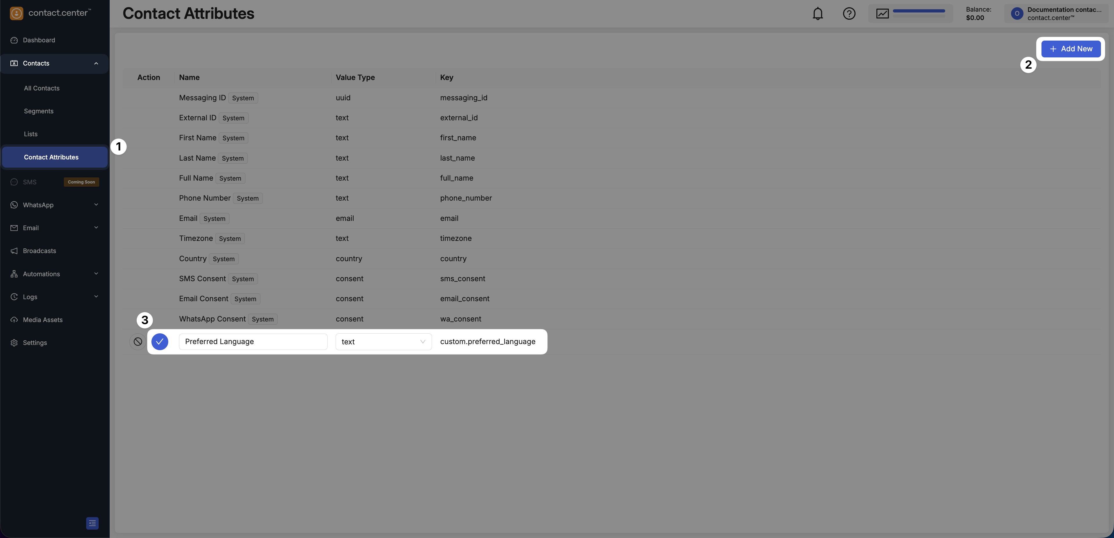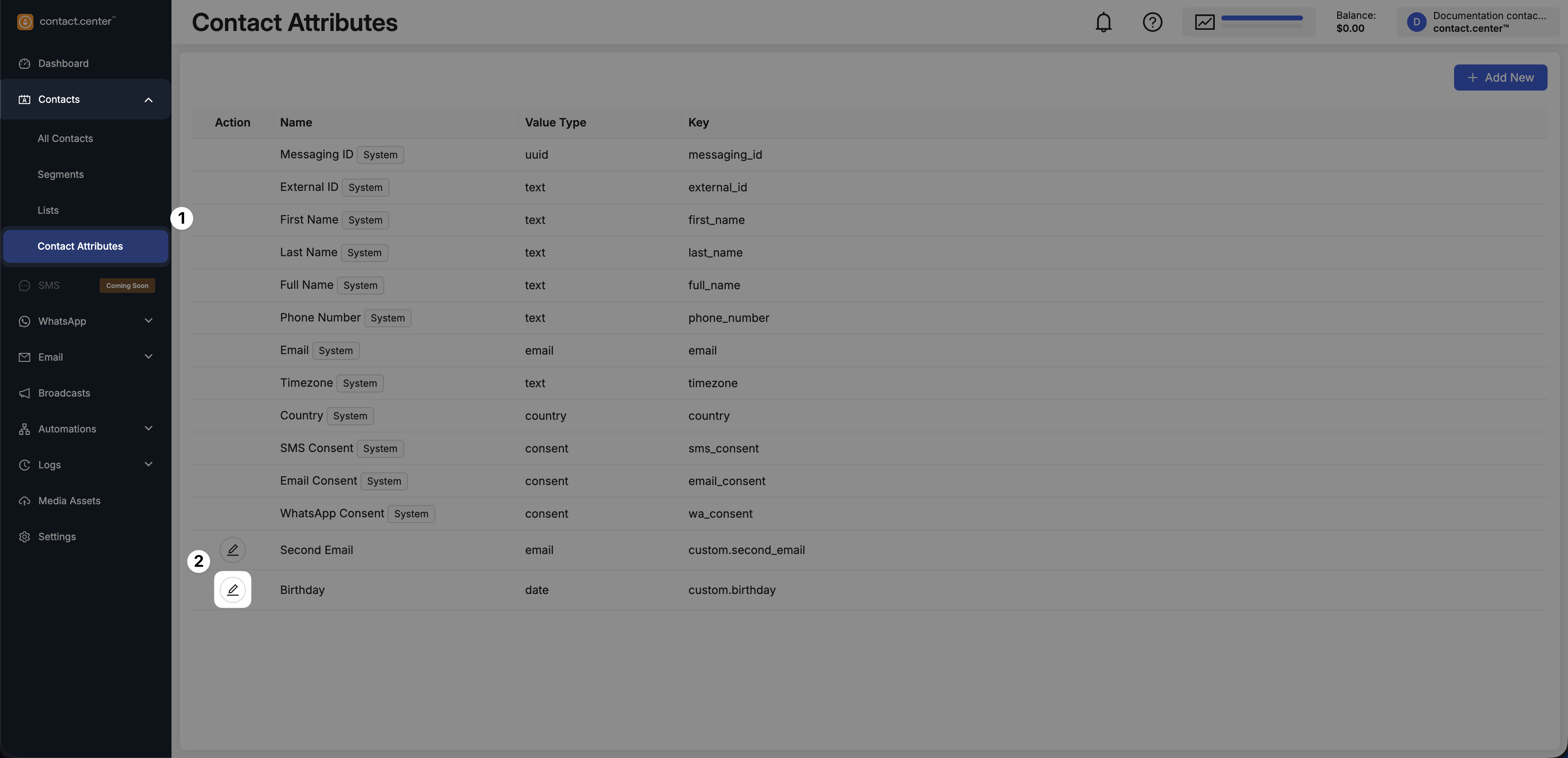 Each contact attribute has a unique Key, which is the internal identifier used across the platform (for example, in filters, segments, automations, and integrations).