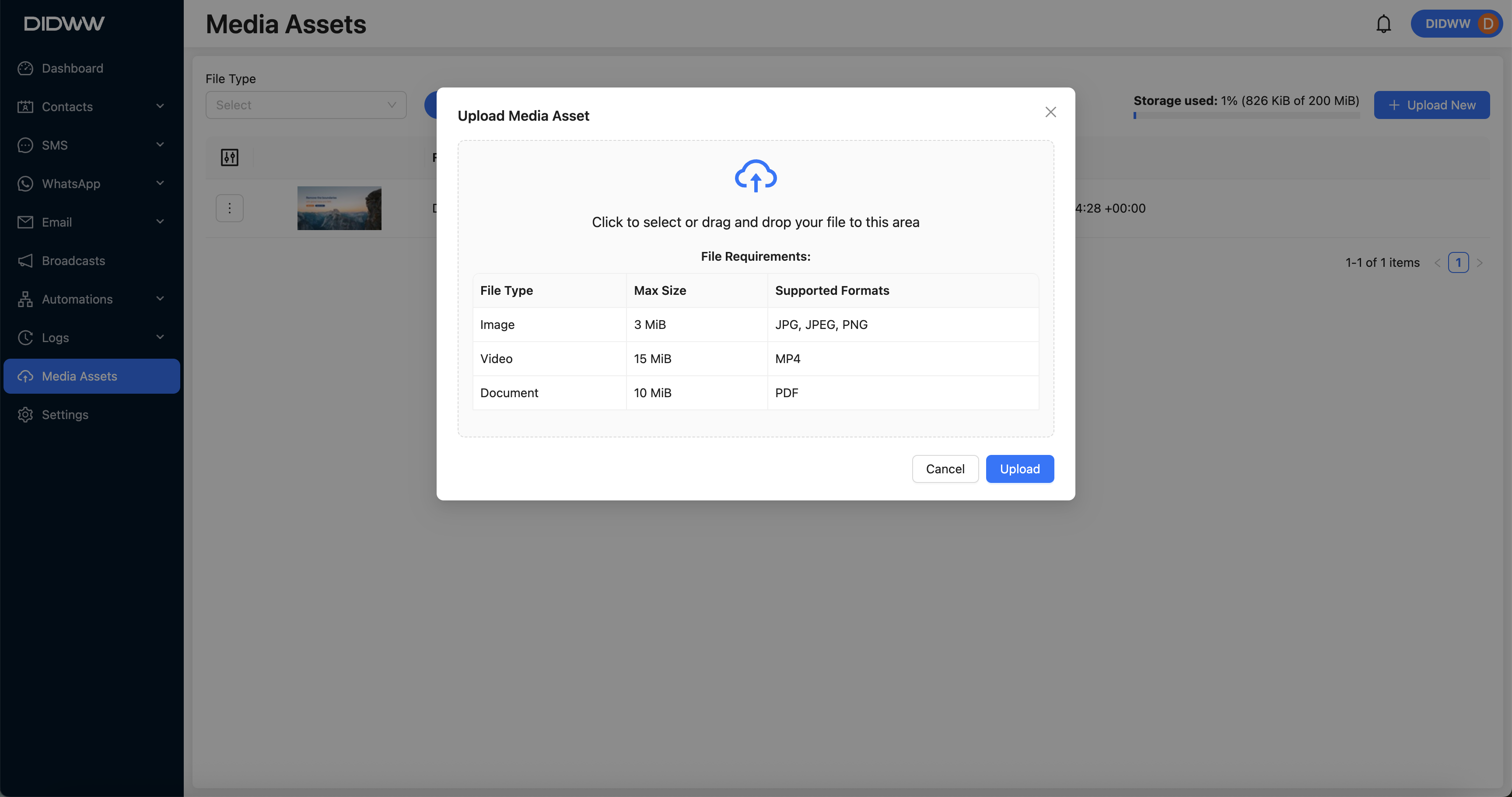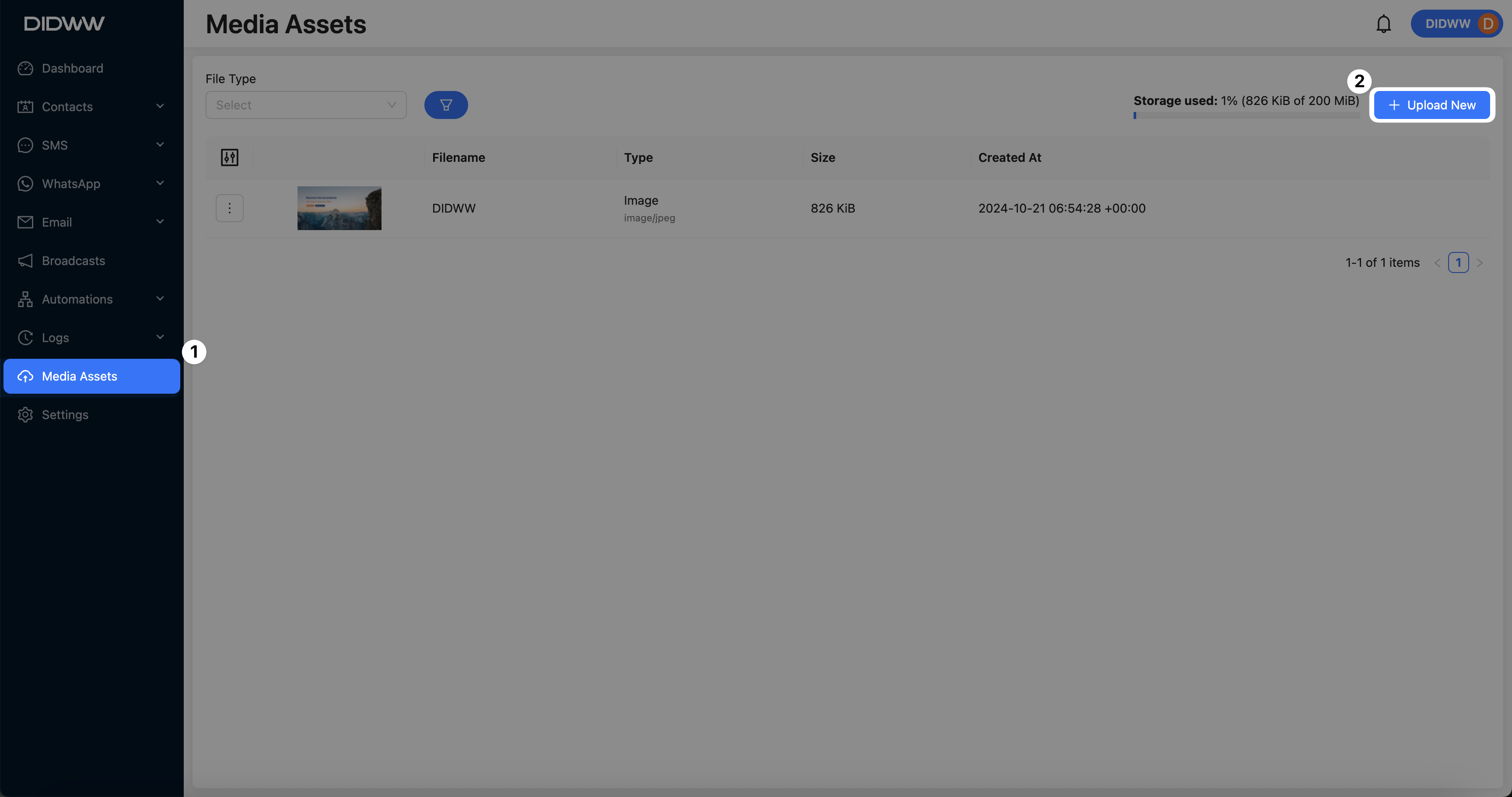 The Media Assets section allows you to upload, store, and manage multimedia files such as images, videos, and PDF documents. These files can be used in email templates and broadcasts.