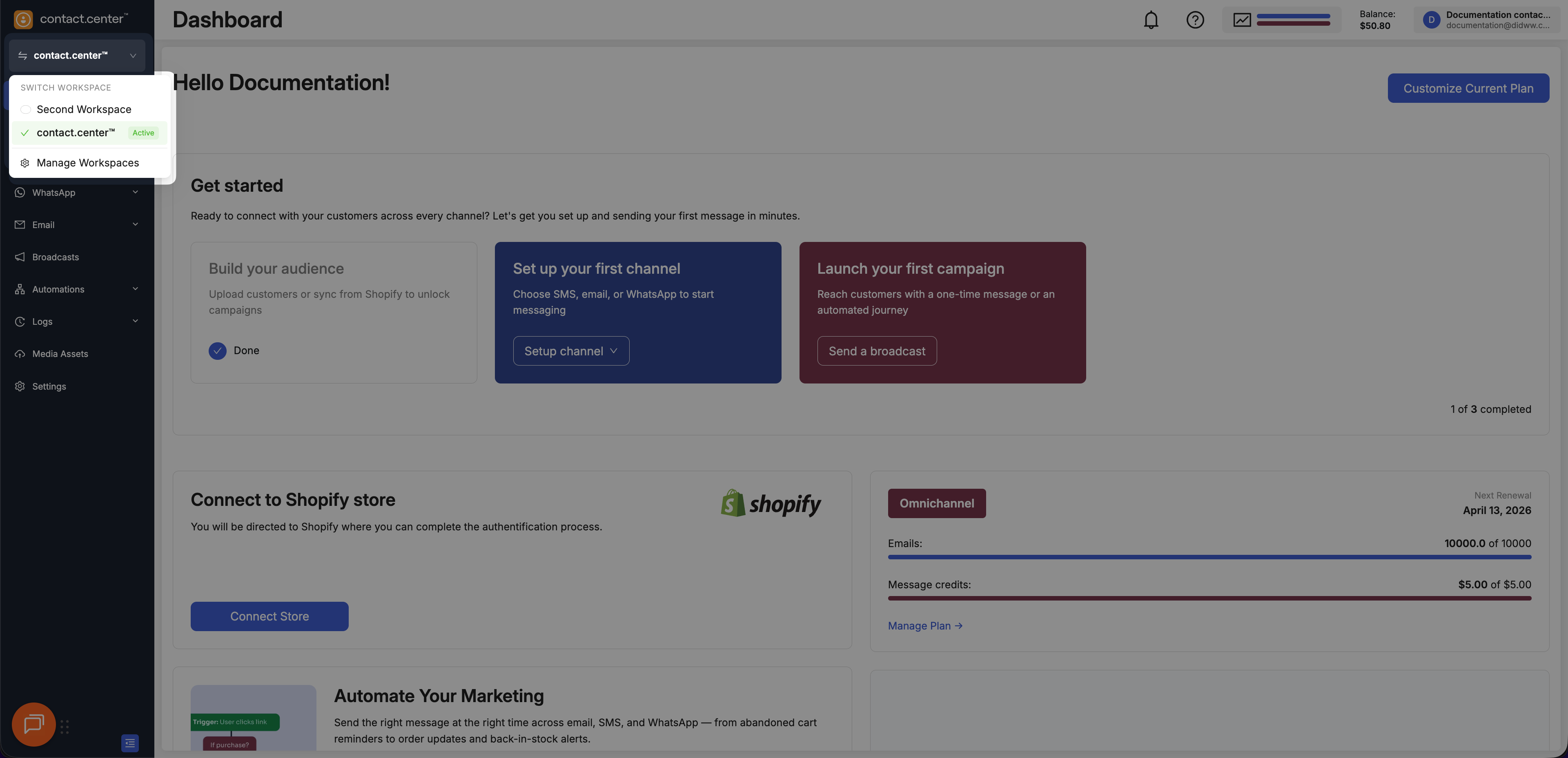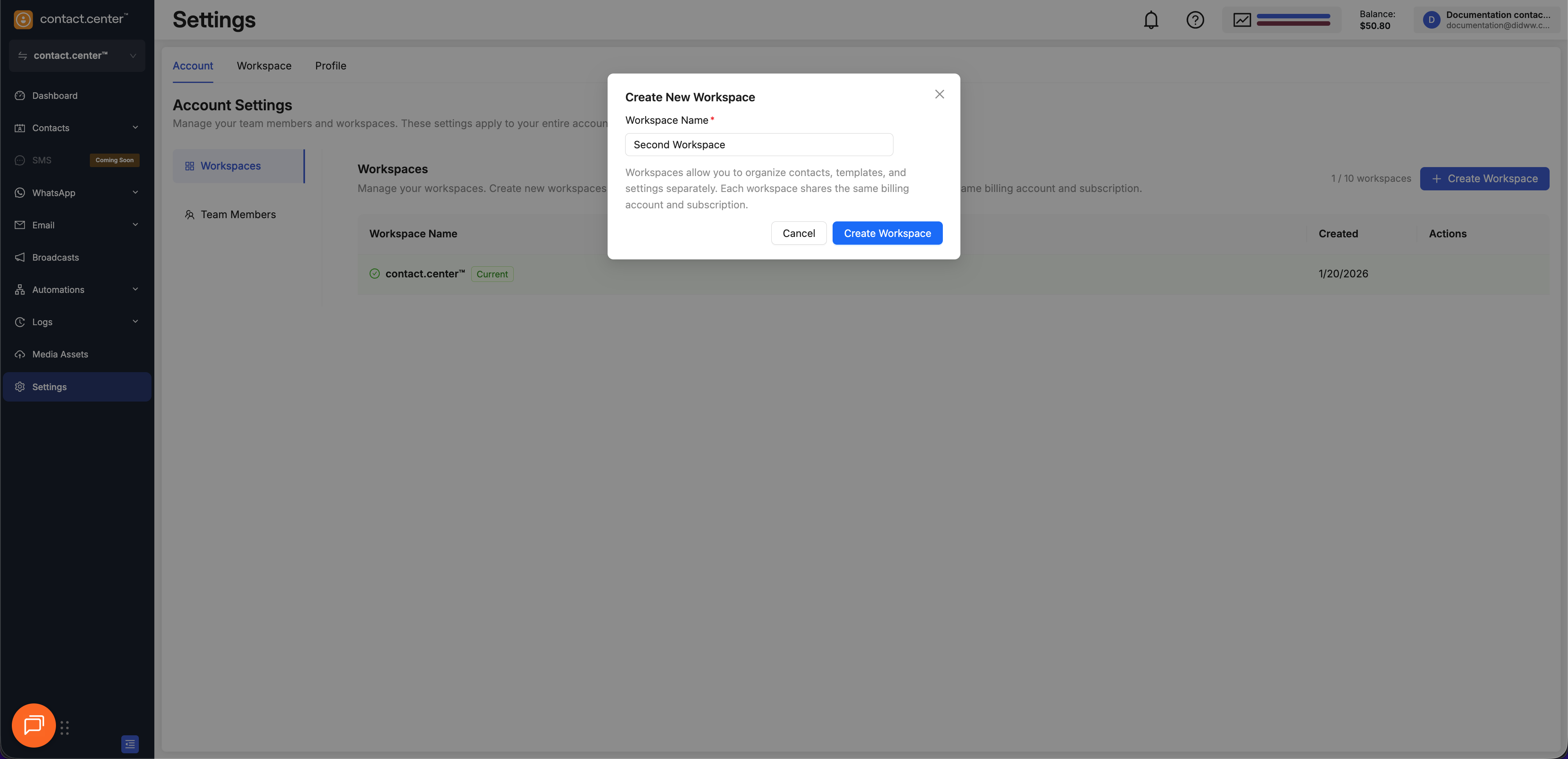 Workspaces allow you to organize contacts, campaigns, templates, and automation workflows. Each workspace operates independently, but all workspaces under the same account share the same billing subscription.
