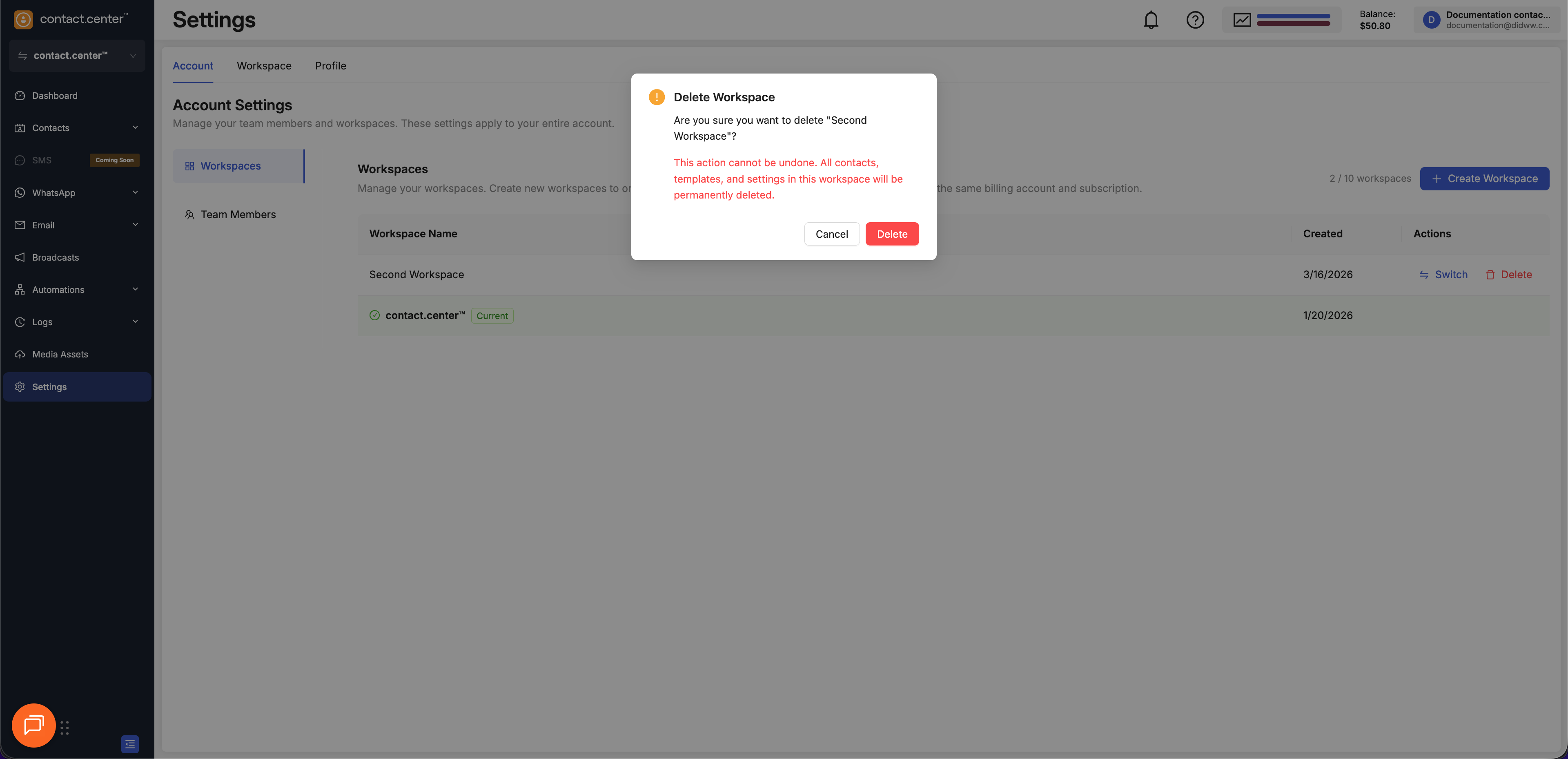 Create, switch, and remove workspaces used to organize contacts, campaigns, templates, and automation settings.