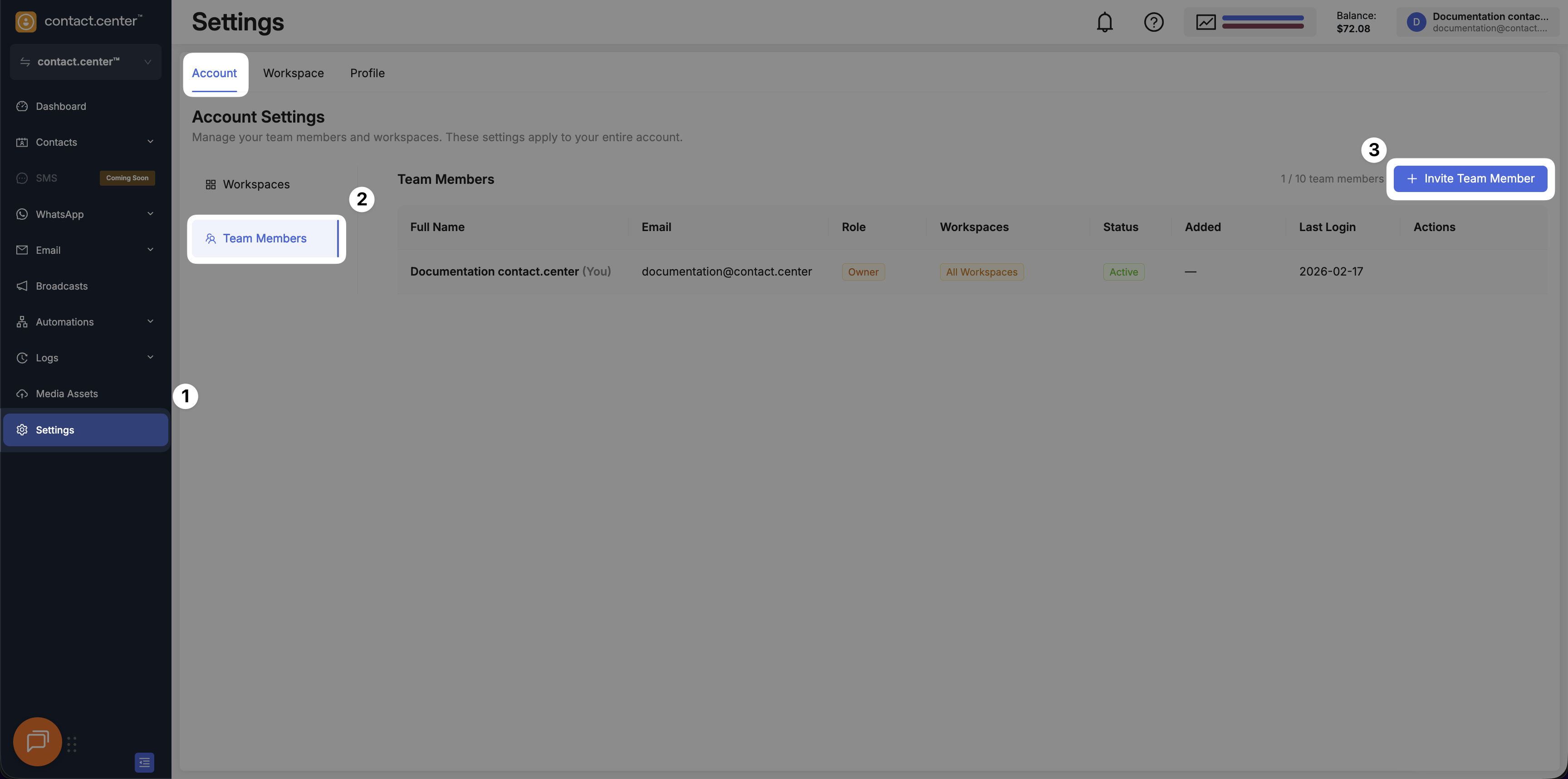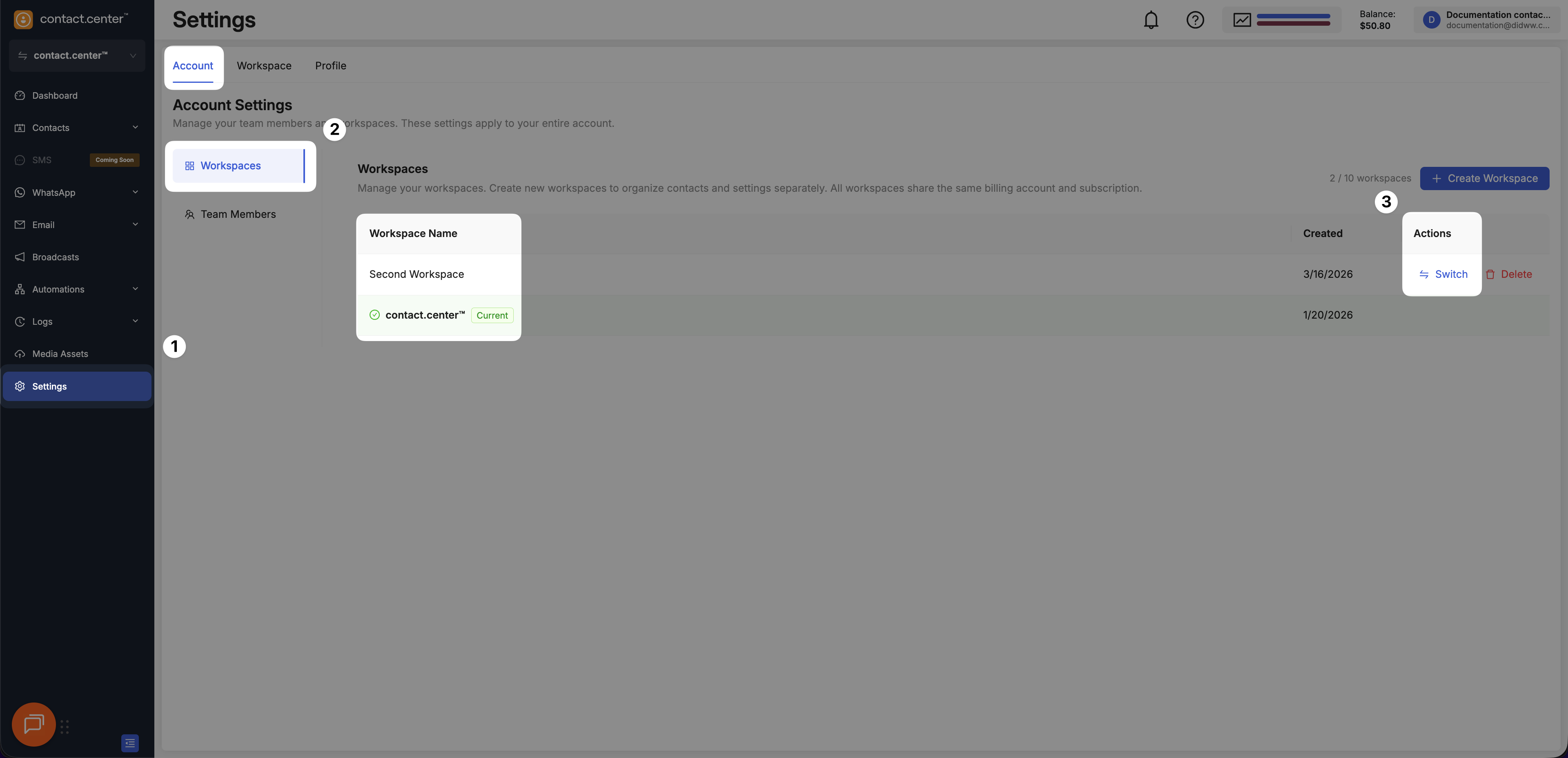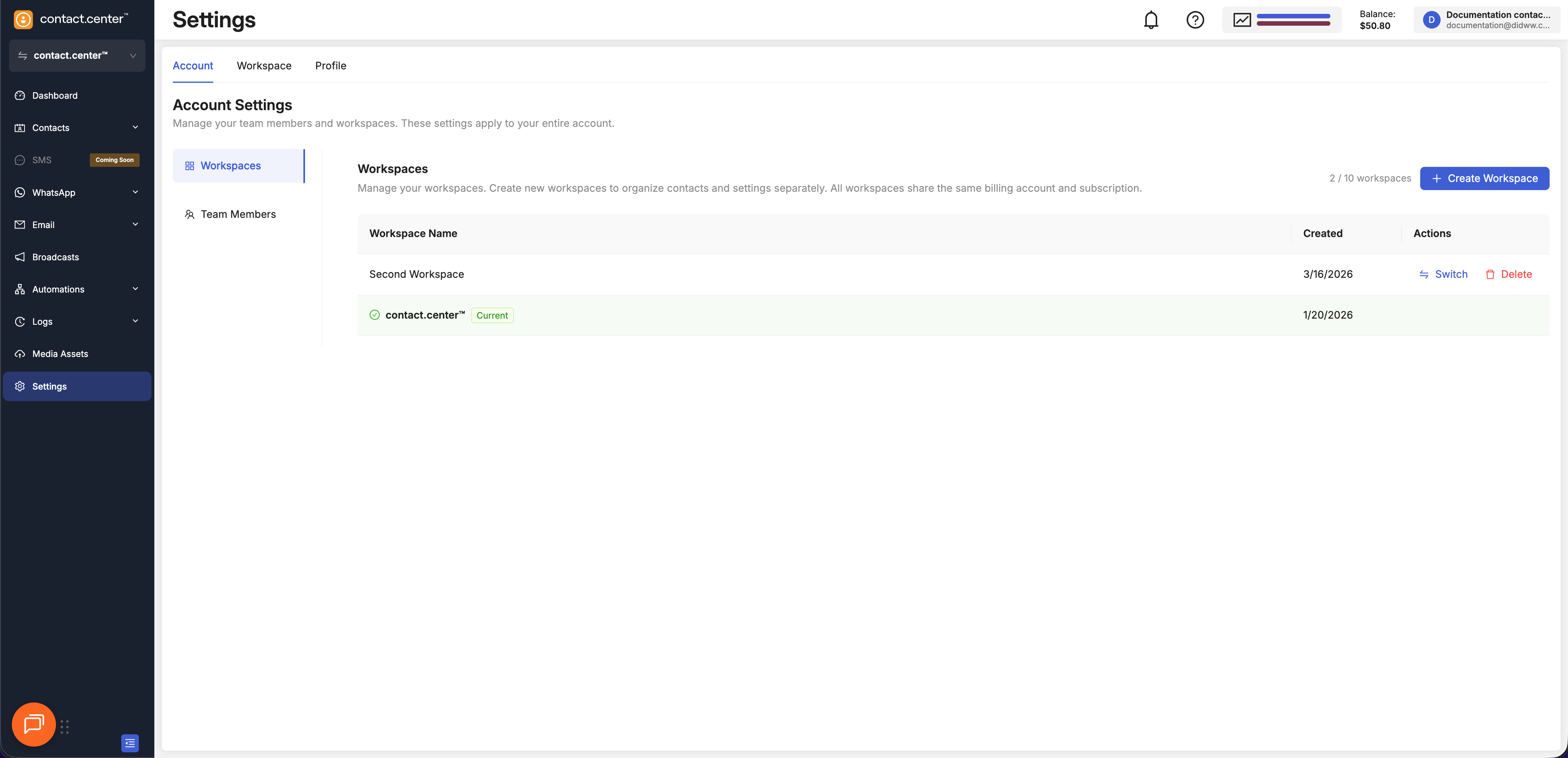 Manage workspaces and team members for your contact.center™ account.