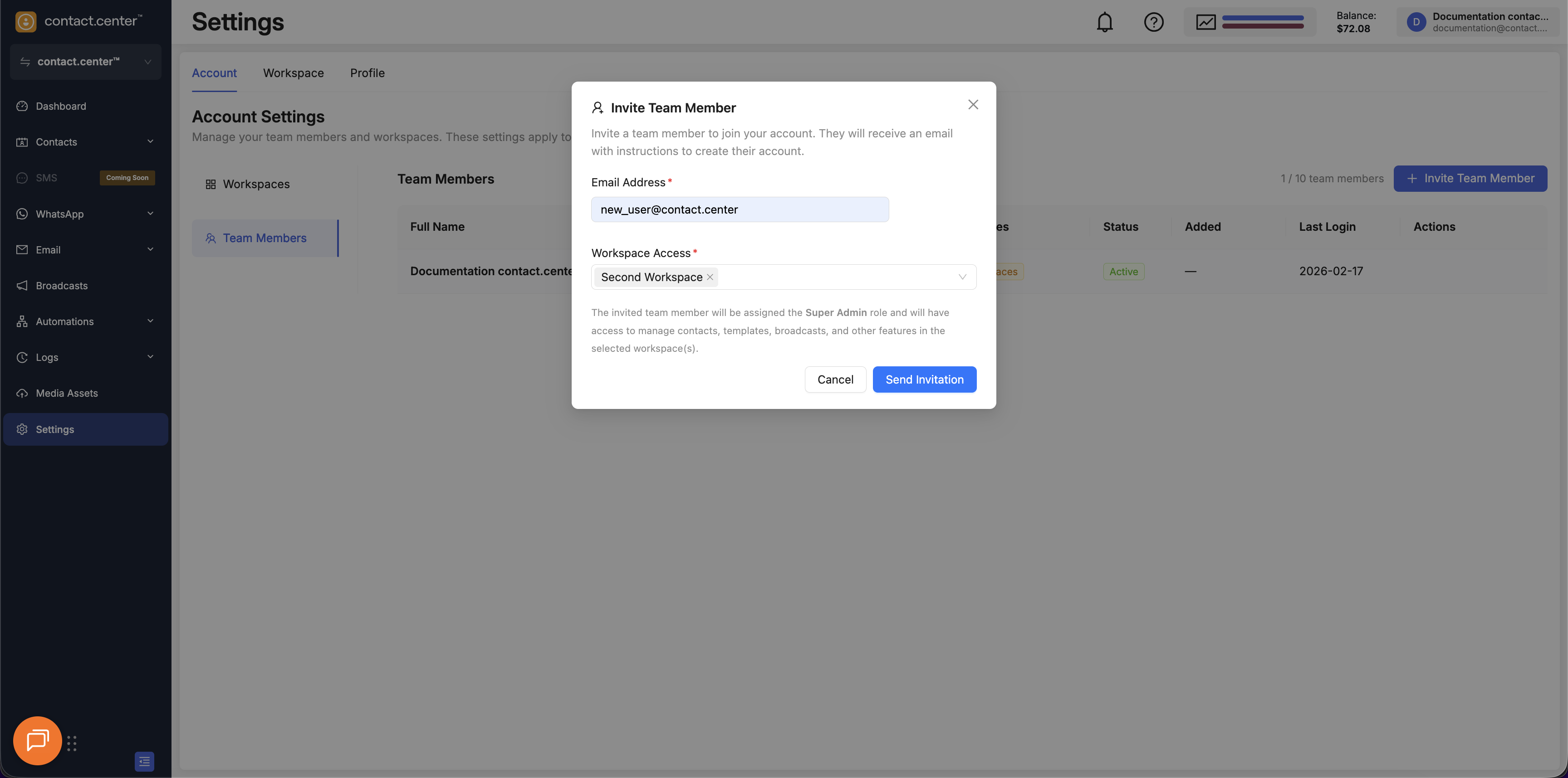 Invited team members are assigned the Super Admin role by default and have full access to the workspace.