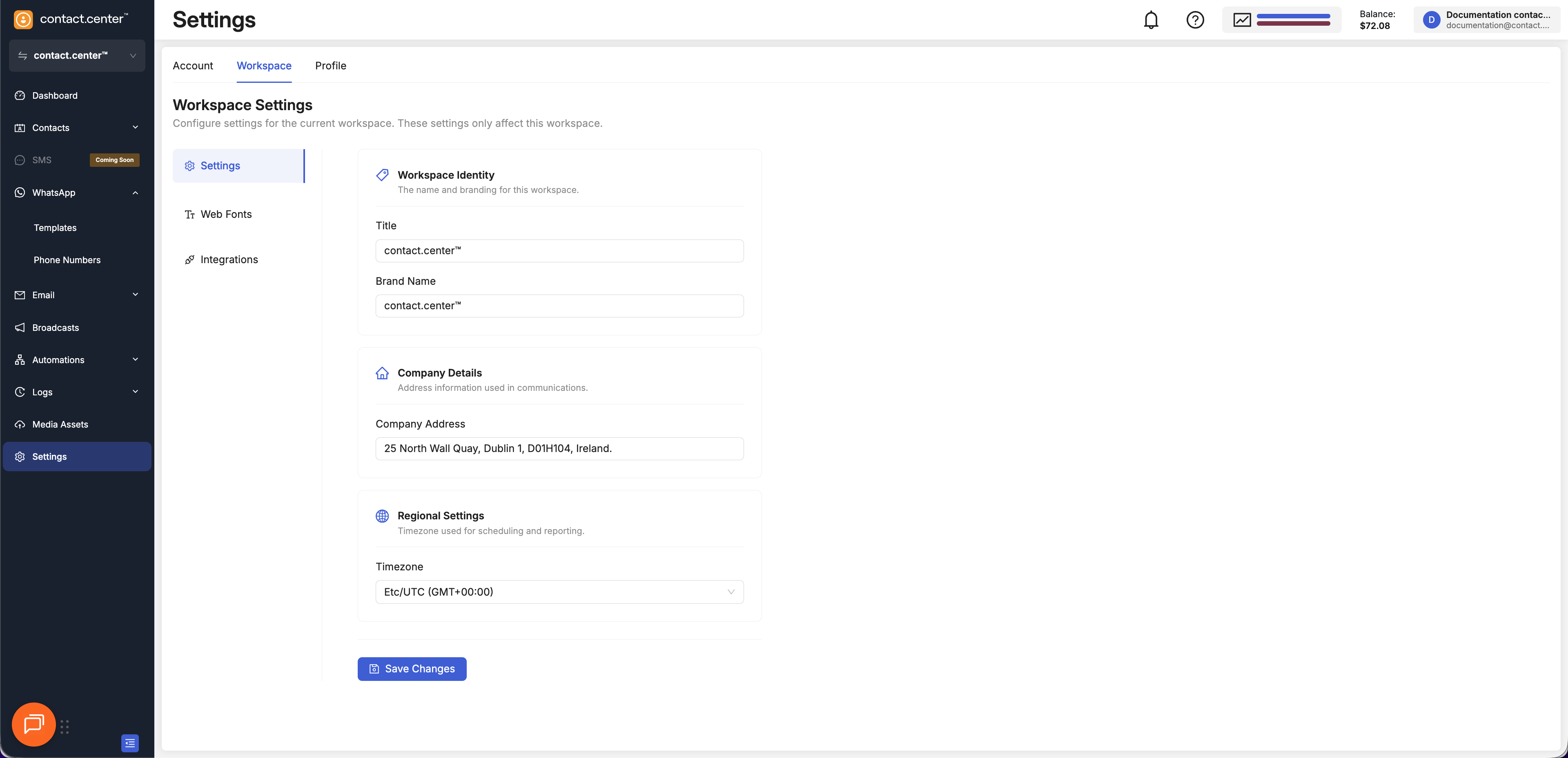 Use this section to update workspace identity, company details, and regional settings such as timezone.